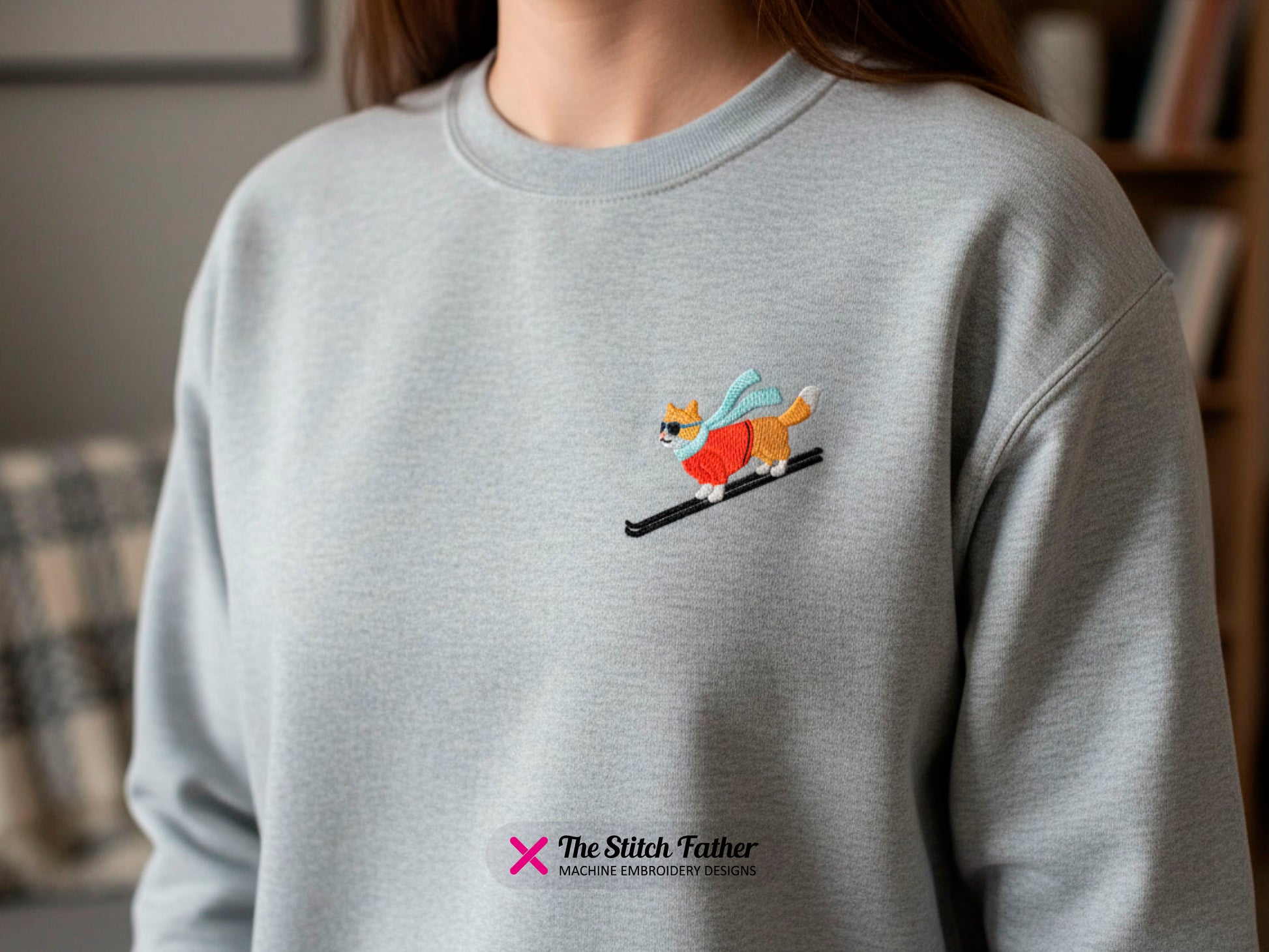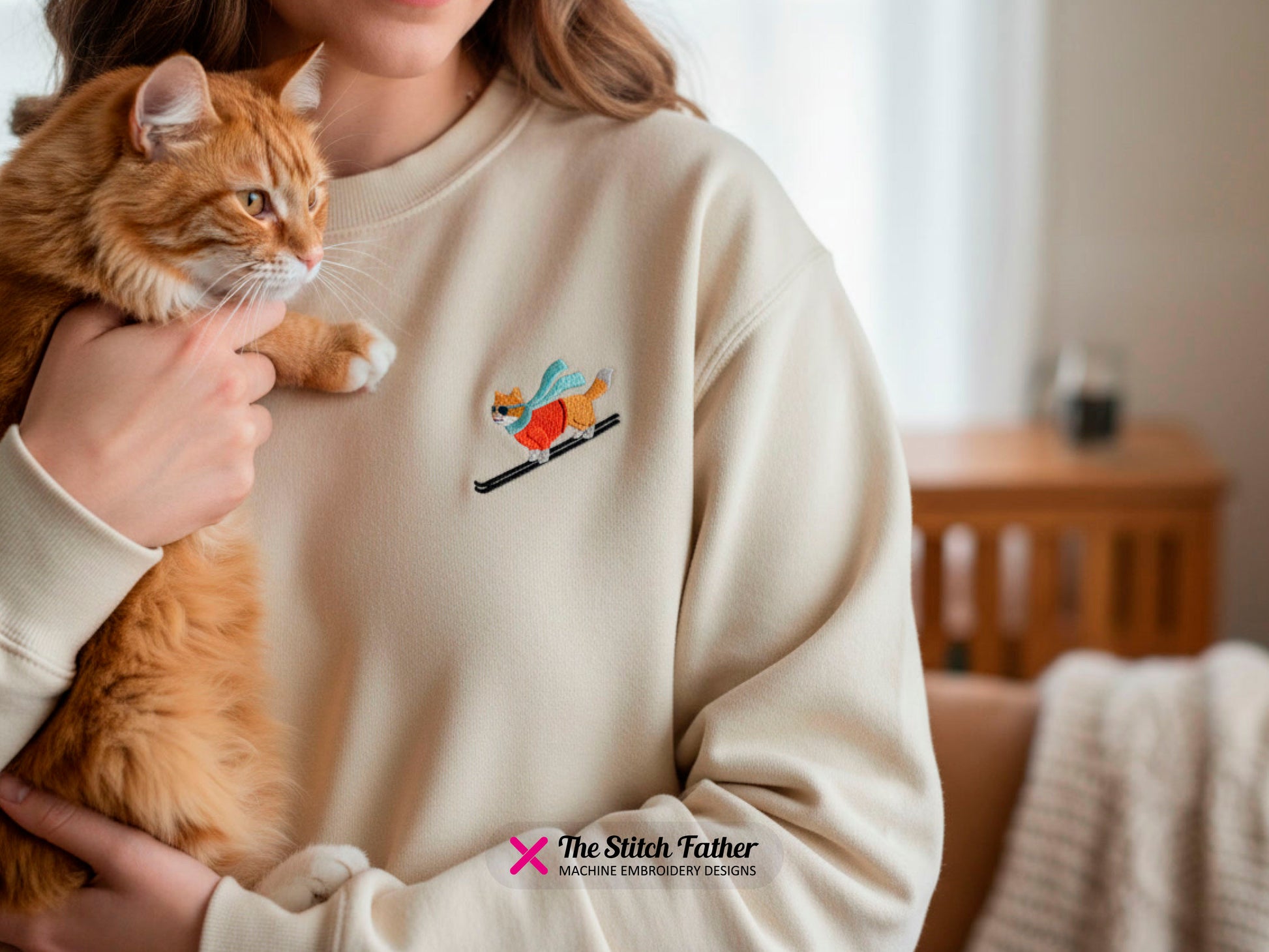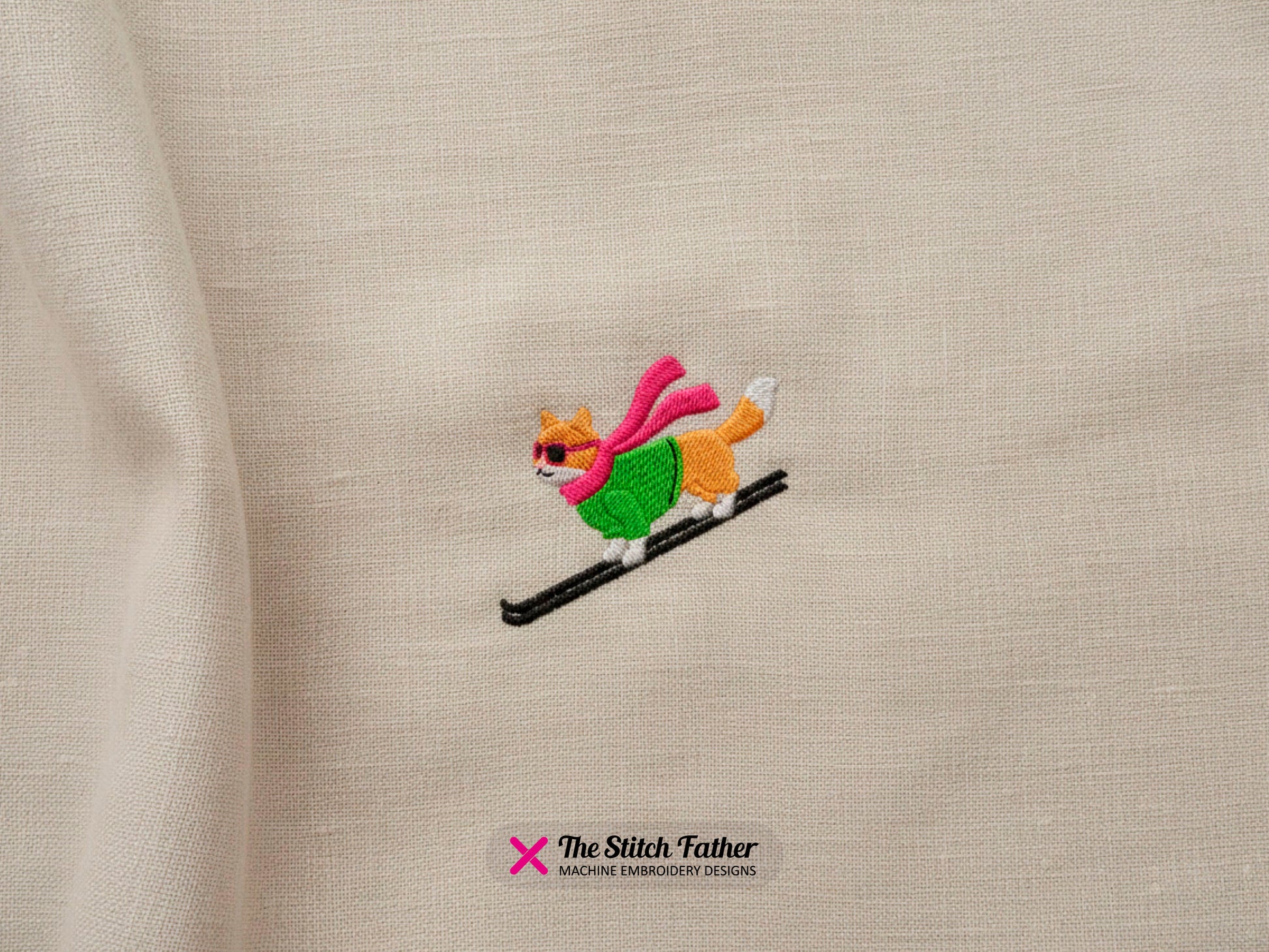 *SOFORT-DOWNLOAD* Stickmuster „Skifahrende Katze“. Rote Katze auf Skiern, Füllstich mit Steppstichdetails, 7 Schritte. Diese verspielte rote Katze auf Skiern verleiht Ihren Projekten einen fröhlichen, trendigen Winter-Touch – perfekt für Katzenliebhaber, die etwas Frisches, Ausgefallenes und Charaktervolles suchen.