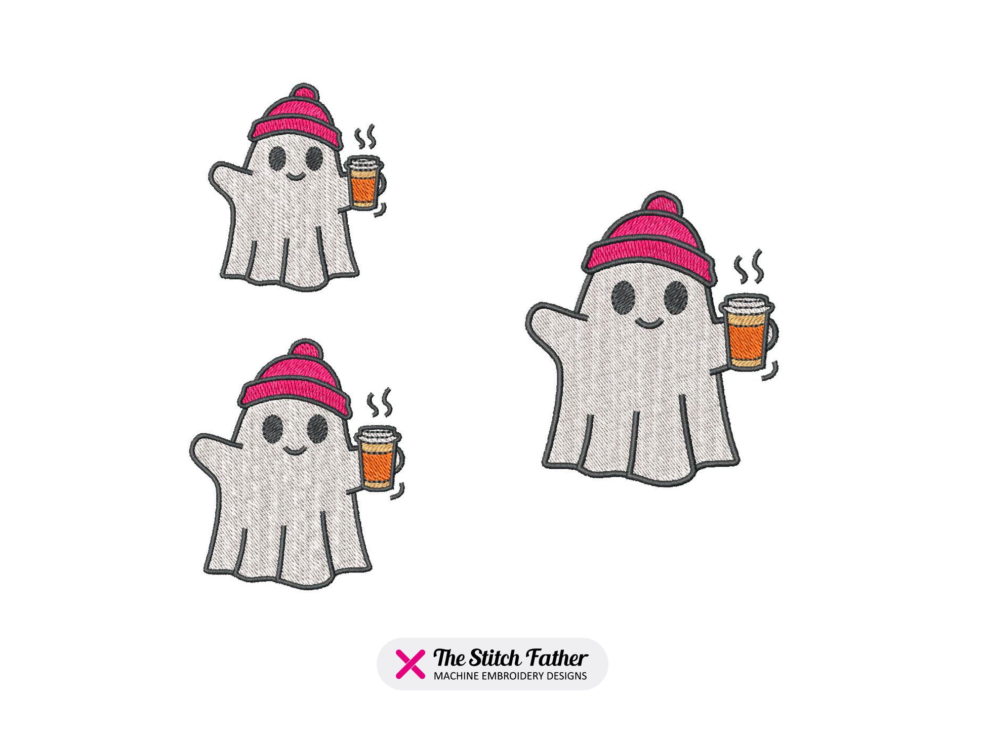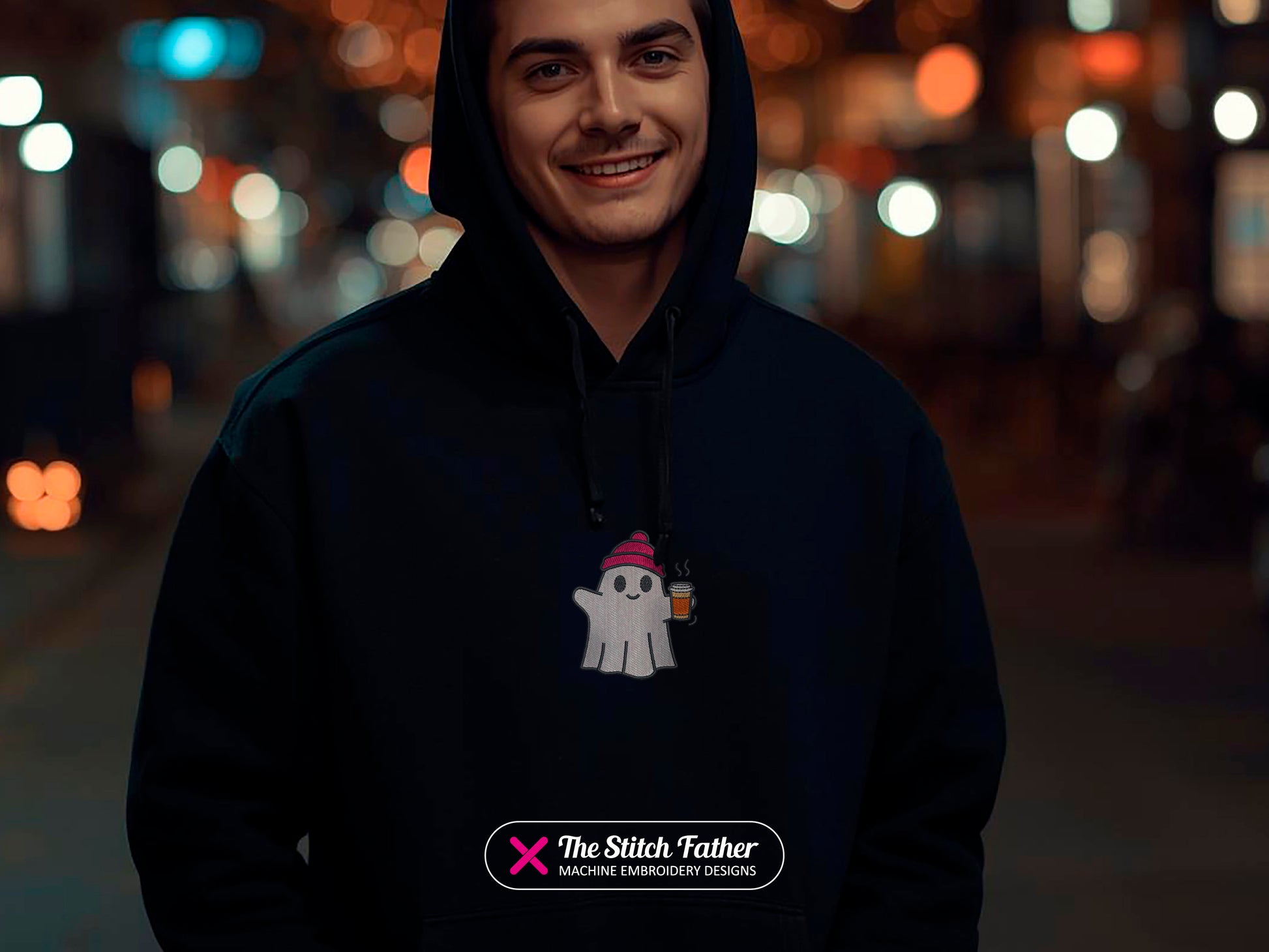 *SOFORT-DOWNLOAD* „GHOST LATTE“ Maschinenstickmuster. Geist mit Wollmütze und Latte Macchiato in der Hand, Satinstich und Füllstich mit Laufstichdetails, 7 Schritte. Dieser niedliche Geist ist eine süße und originelle Ergänzung für jedes Halloween-Outfit – besonders für Kaffeeliebhaber!