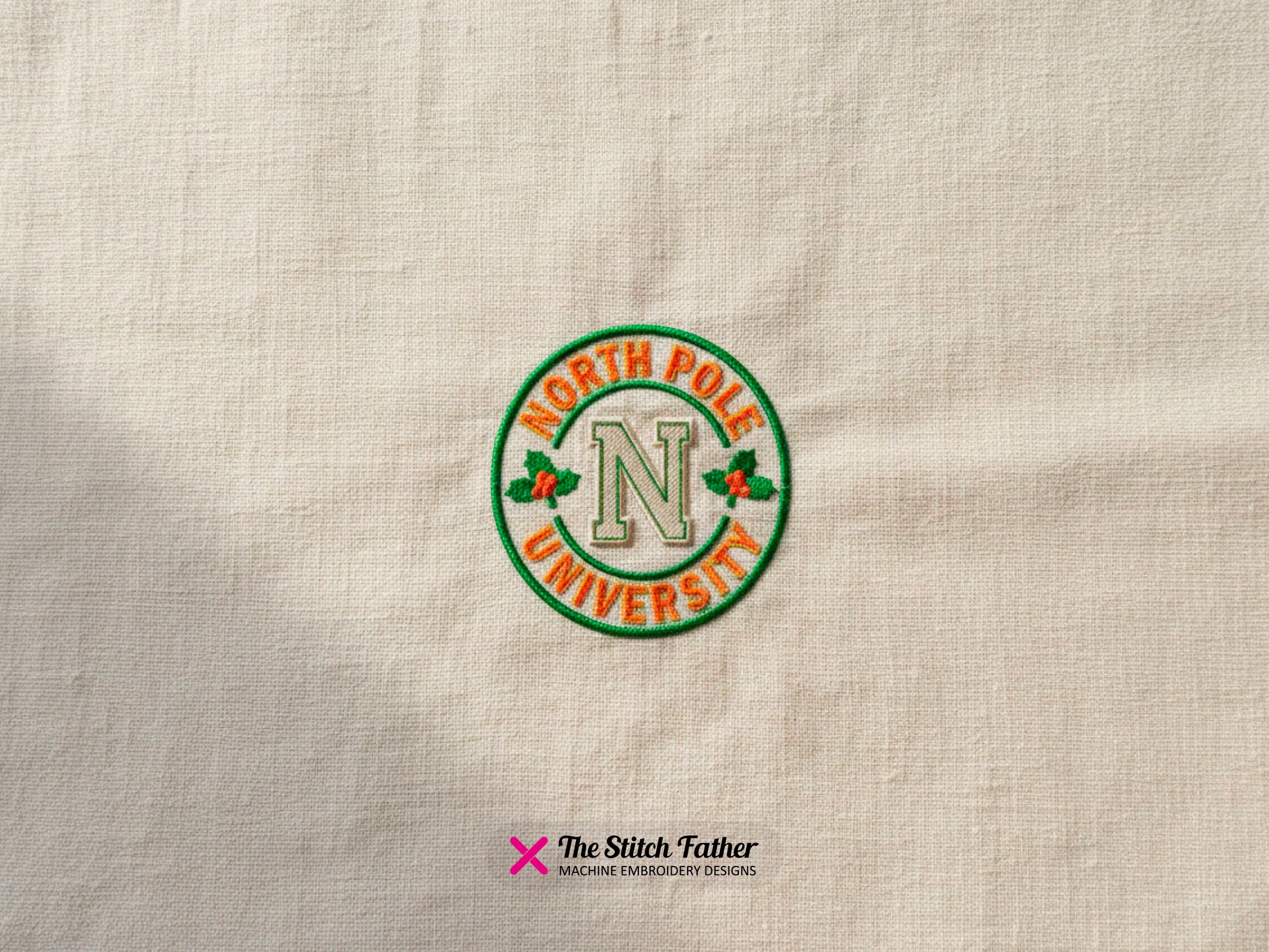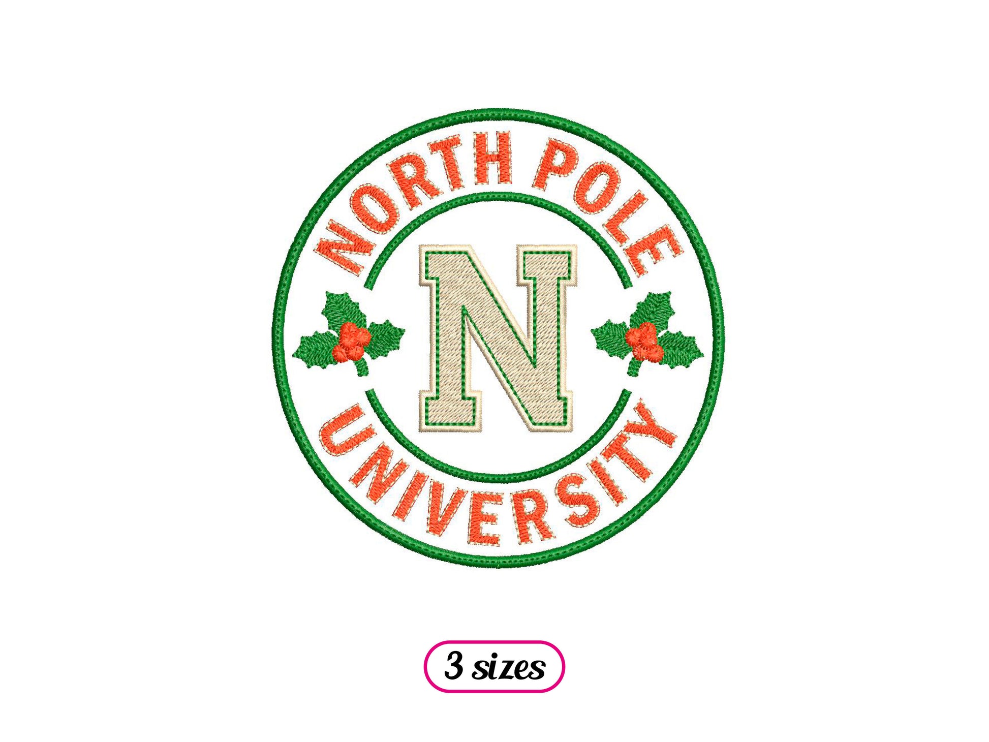 *SOFORT-DOWNLOAD* Stickdatei „NORTH POLE UNIVERSITY“. Das Logo der North Pole University ist mit Stechpalmenblättern verziert. Satinstich, Füllstich und Steppstichdetails, 7 Stickschritte. Dieses Design im Vintage-Stil verleiht Ihrer Kleidung und Ihren Accessoires einen charmanten, festlichen Touch und ist perfekt, um jedem Projekt eine nostalgische Weihnachtsnote zu verleihen.