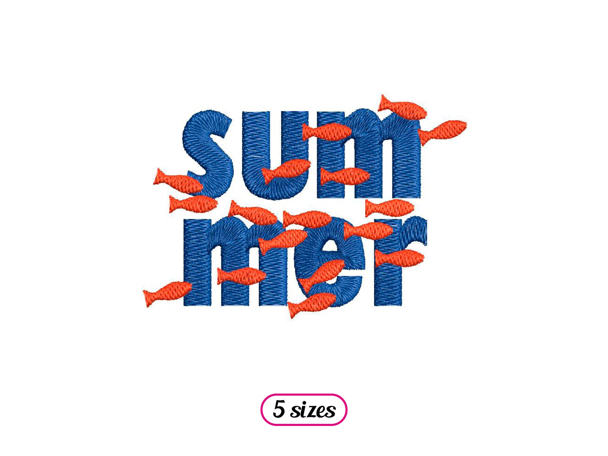 *SOFORT-DOWNLOAD* Maschinenstickmuster „SUMMER FISH GROUP“. Fischschwarm mit dem englischen Text „Summer“ im Hintergrund, Füllstich, 2 Schritte. Die weißen Bereiche sind offen für Stoff. Ein trendiges, minimalistisches Logo, das Ihre Strandkleidung und Accessoires diesen Sommer verschönert!