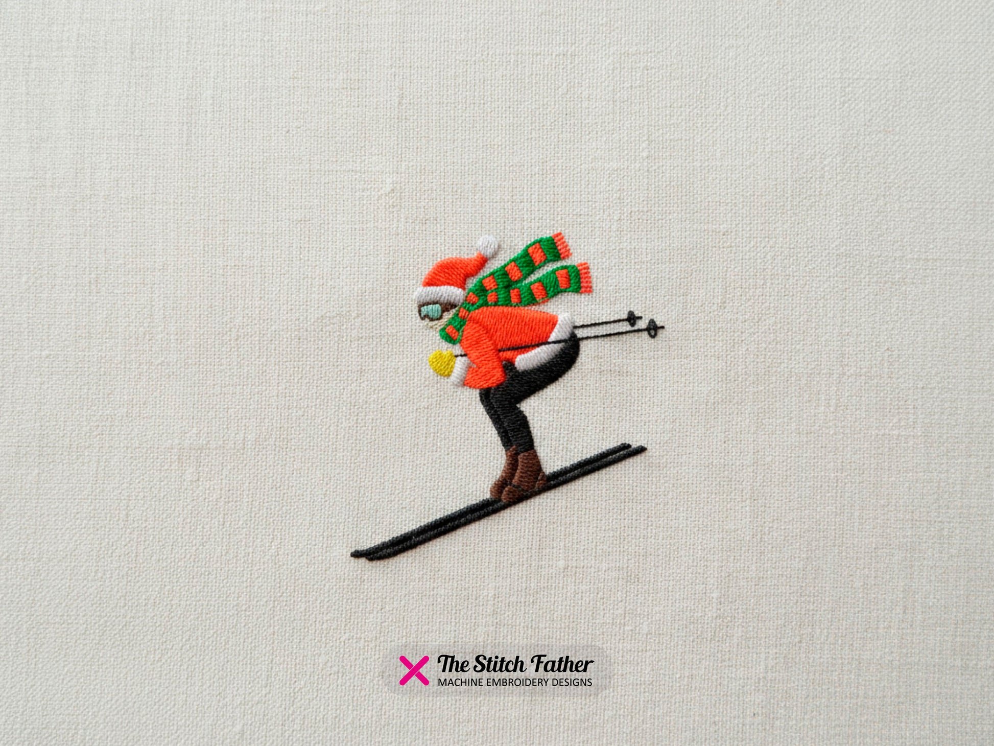 *TÉLÉCHARGEMENT INSTANTANÉ* Motif de broderie machine « SKIEUR DE NOËL EN DESCENTE ». Skieur de Noël dévalant la piste, broderie en point de remplissage avec détails en point de piqûre, 9 étapes. Créez des projets de Noël amusants et festifs avec ce motif unique de skieur inspiré du Père Noël, parfait pour ajouter une touche tendance et fantaisiste à vos vêtements, cadeaux et décorations de saison !