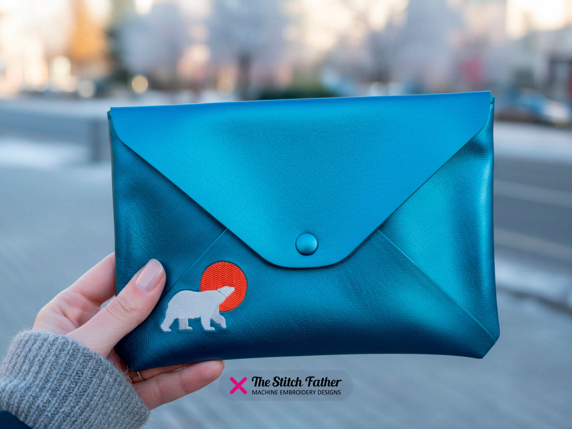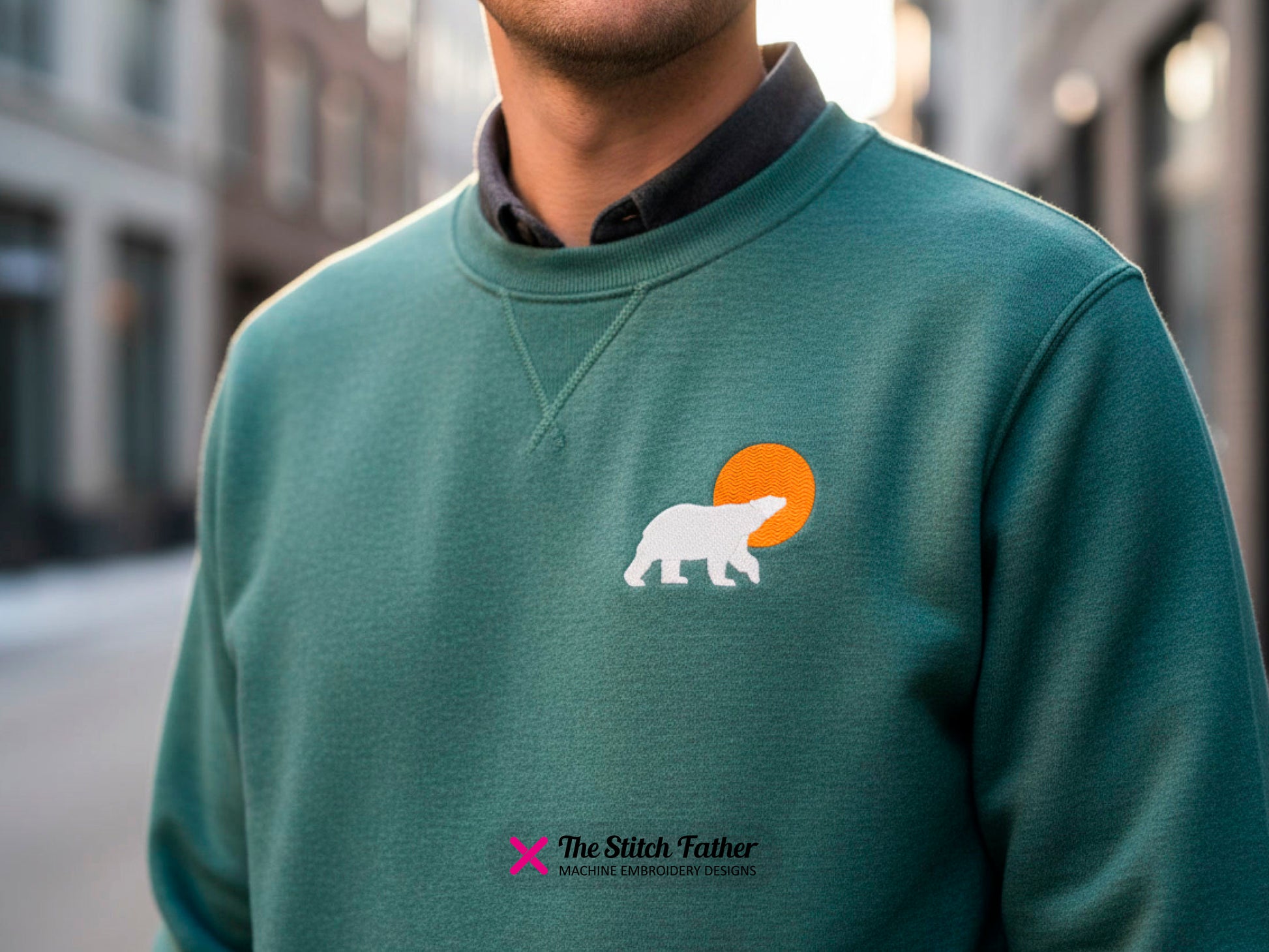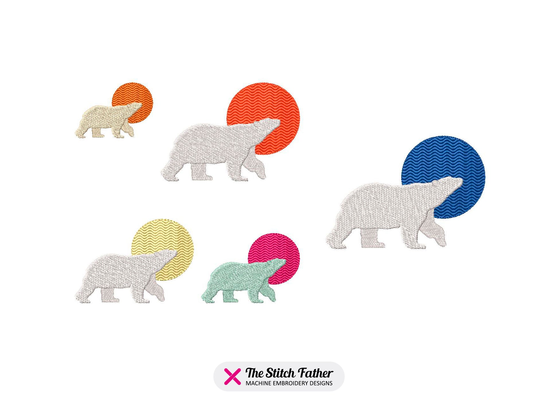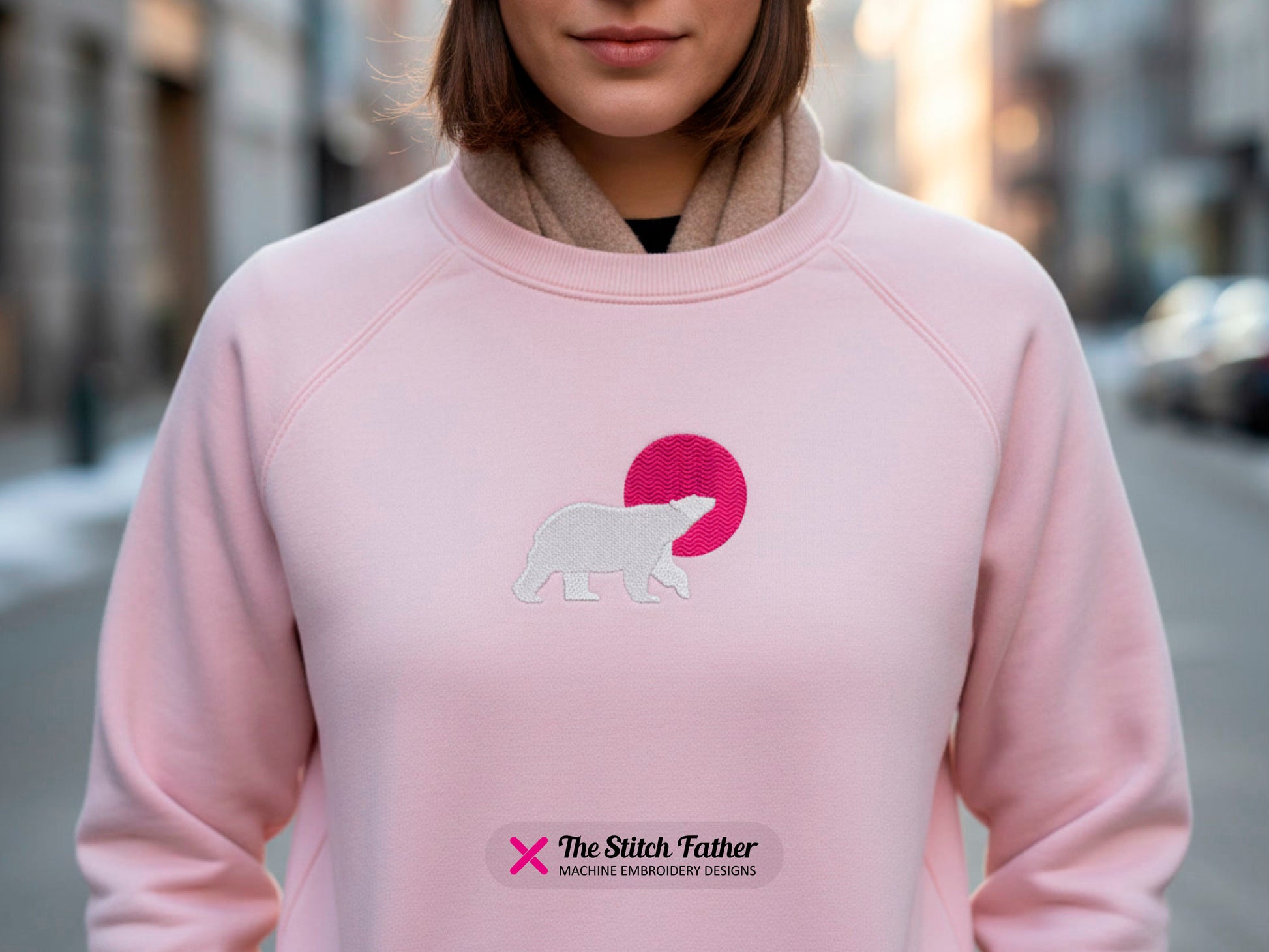 *TÉLÉCHARGEMENT INSTANTANÉ* Motif de broderie machine « SILHOUETTE D'OURS POLAIRE AU SOLEIL ». Silhouette d'ours polaire sur un soleil à la texture ondulée, point de remplissage, 2 étapes. Ce motif épuré et moderne est indispensable pour sublimer vos créations d'une touche élégante et inspirée par la nature, à la fois intemporelle et tendance !