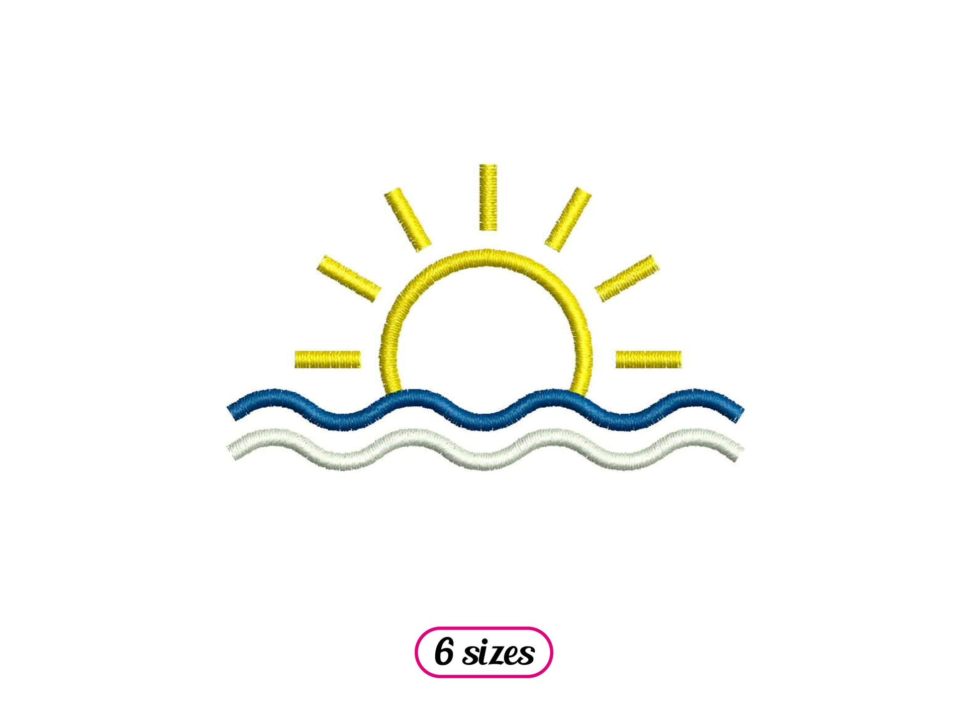 *TÉLÉCHARGEMENT INSTANTANÉ* Motif de broderie machine SUN WAVES LINE. Logo au point satin représentant le soleil avec des vagues, trois couleurs. Un motif rapide et facile pour embellir vos casquettes et plus encore ; utilisez l'espace du bas comme emplacement de nom !