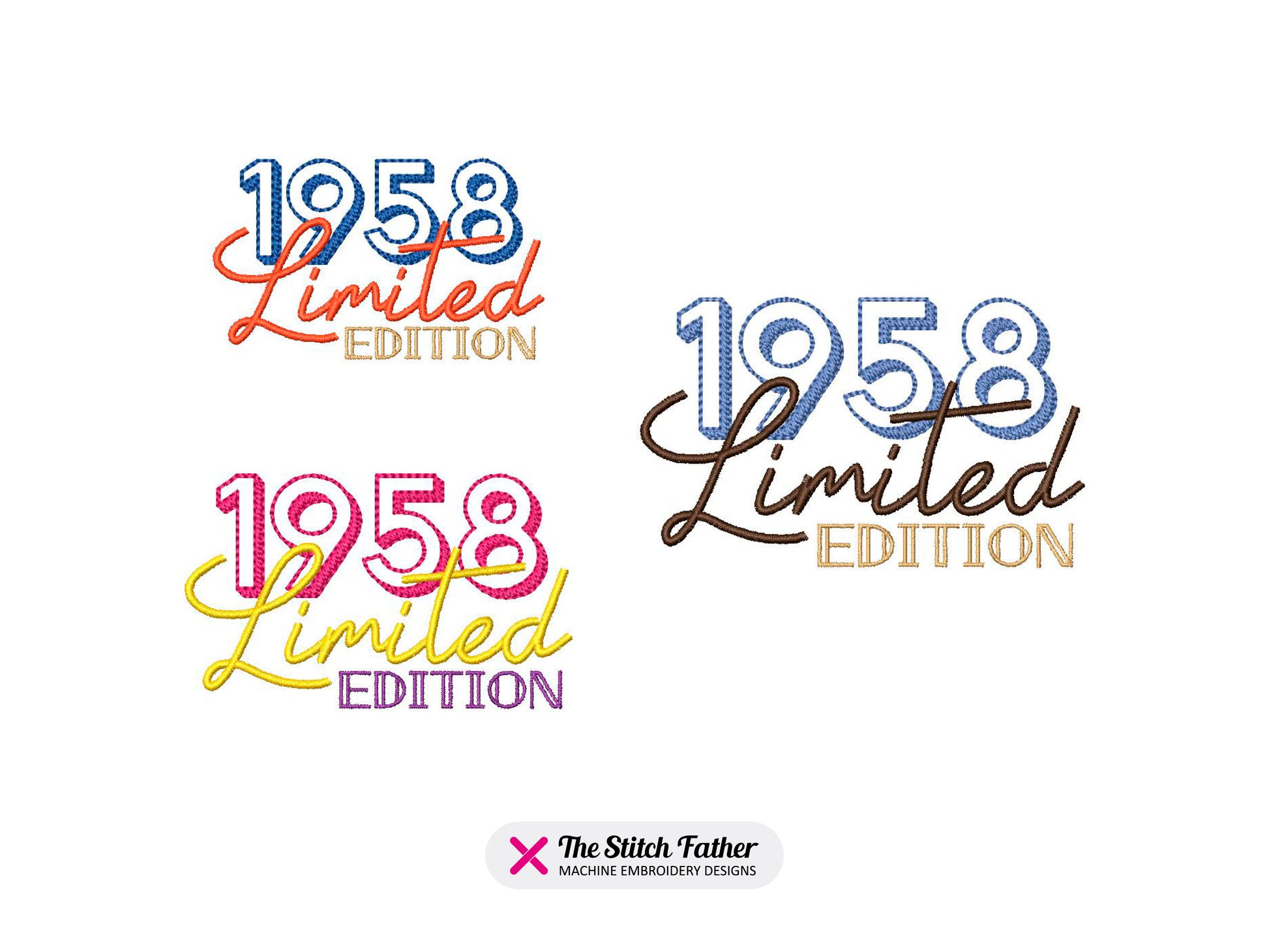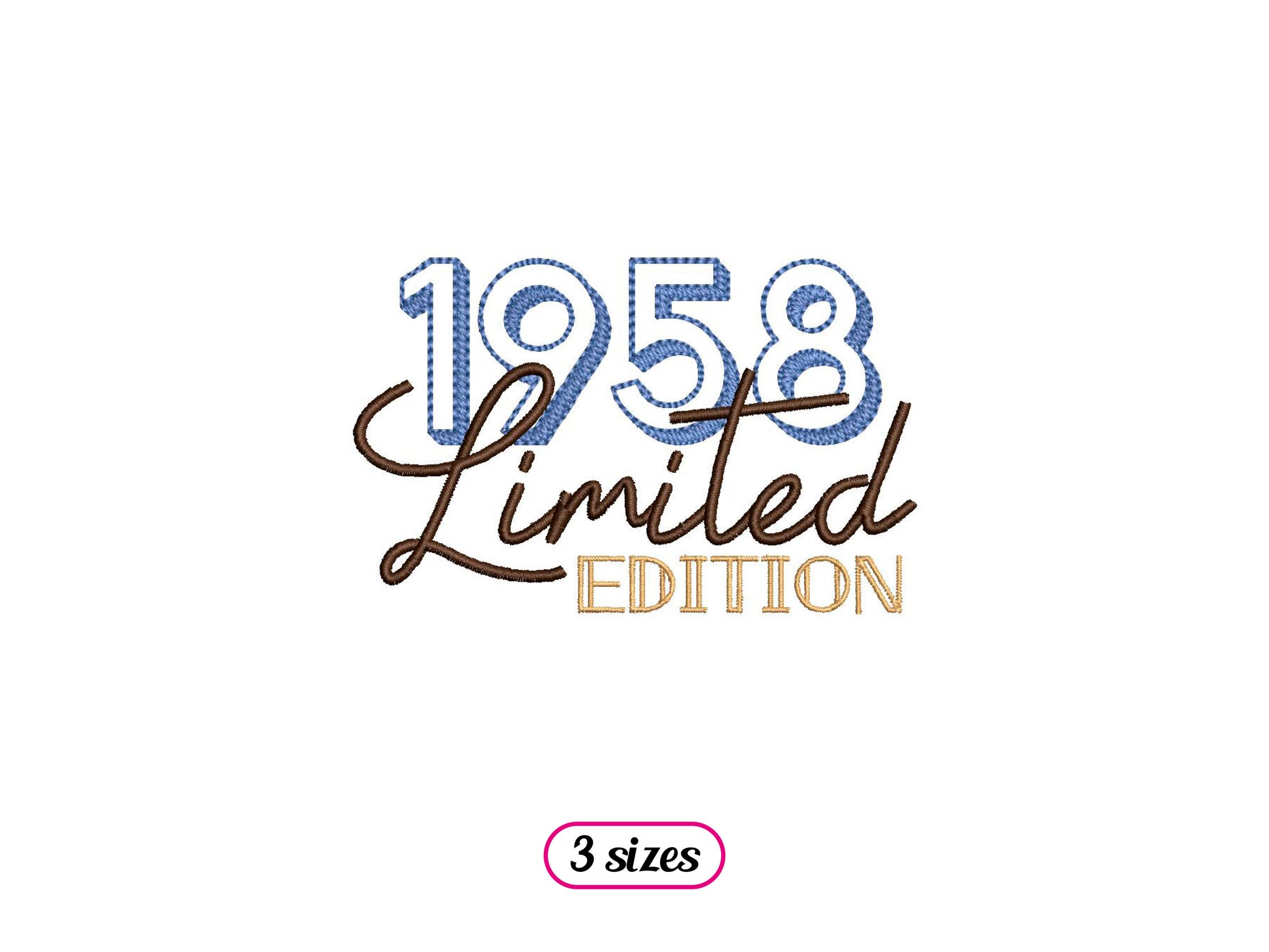 *INSTANT DOWNLOAD* “1958 LIMITED EDITION” machine embroidery design. Birthday logo of the year 1958, satin stitch and fill stitch with running stitch details, 3 steps. The white areas are open to fabric. An elegant pattern to make unique presents for a birthday party!