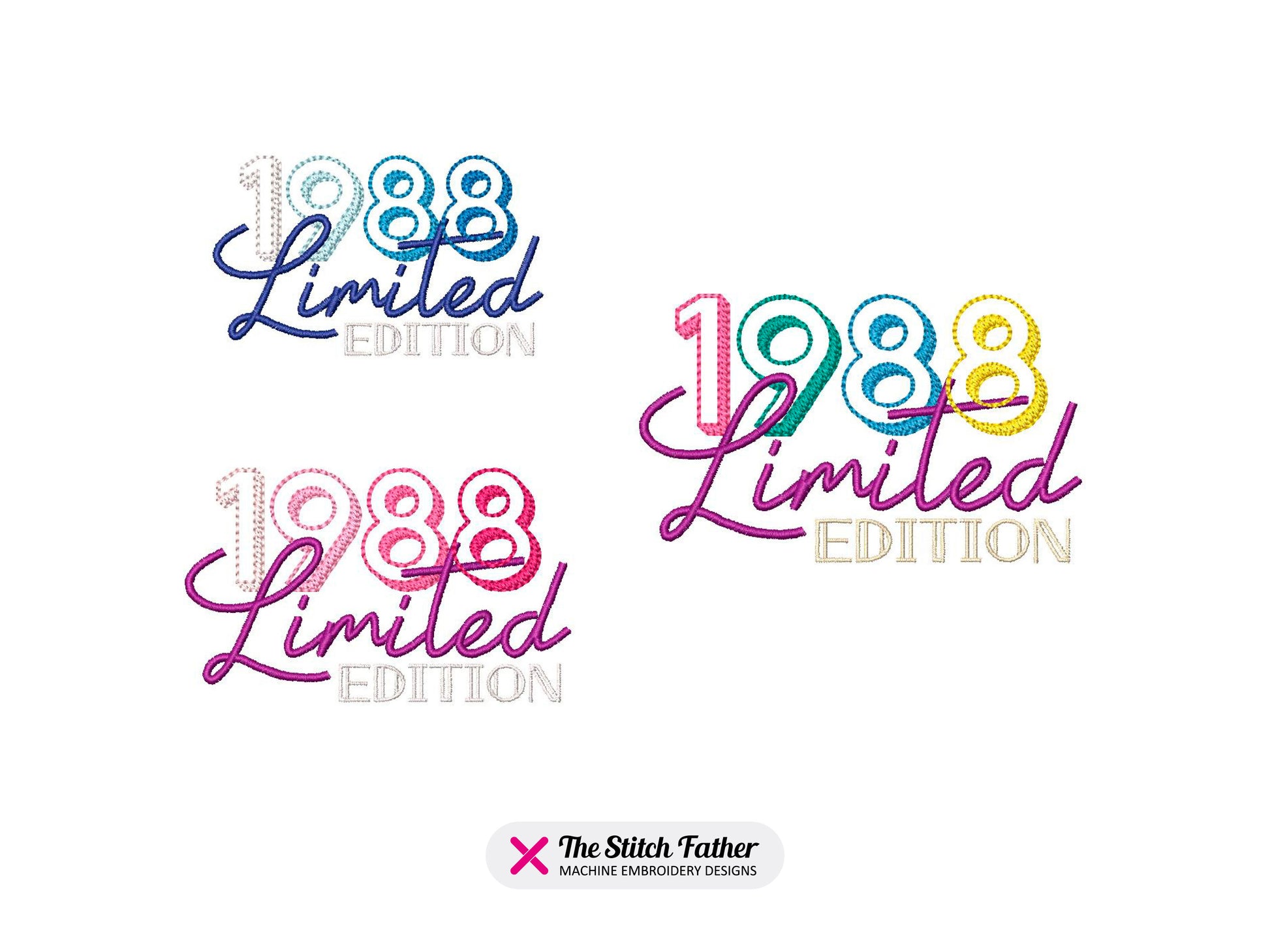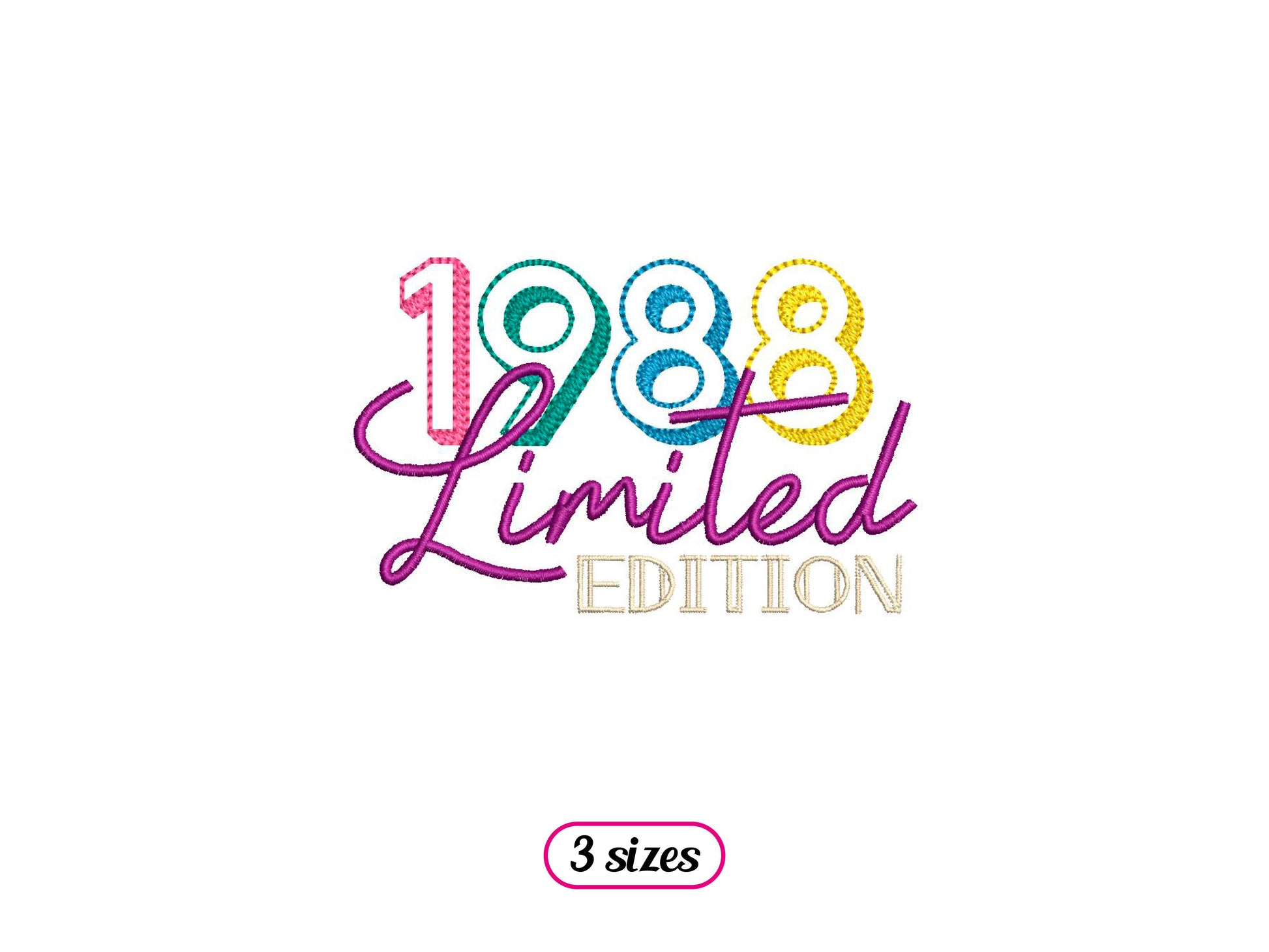 *INSTANT DOWNLOAD* “1988 LIMITED EDITION” machine embroidery design. Birthday logo of the year 1988, satin stitch and fill stitch with running stitch details, 6 steps. The white areas are open to fabric. A colorful pattern to celebrate the 80s and make unique presents for a birthday party!