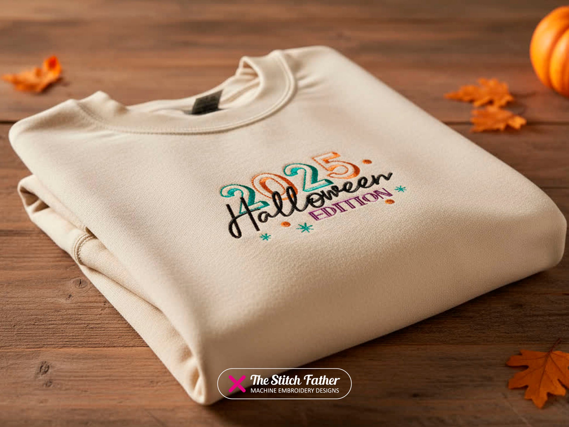 Halloween logo of the year 2025, satin stitch and fill stitch with running stitch details, 6 steps. The white areas are open to fabric. A perfect embroidery design to make memorable and unique accessories to celebrate Halloween 2025!