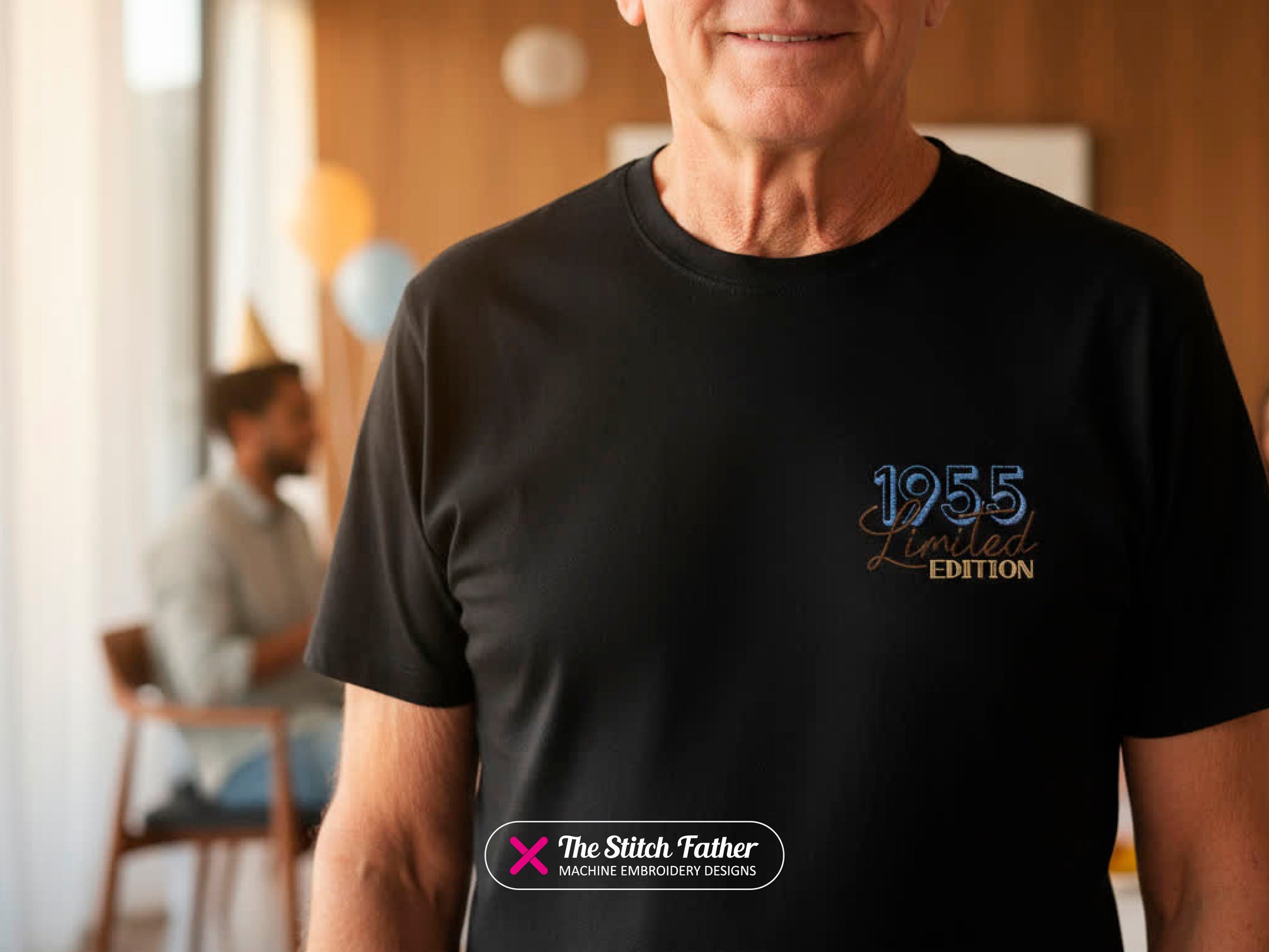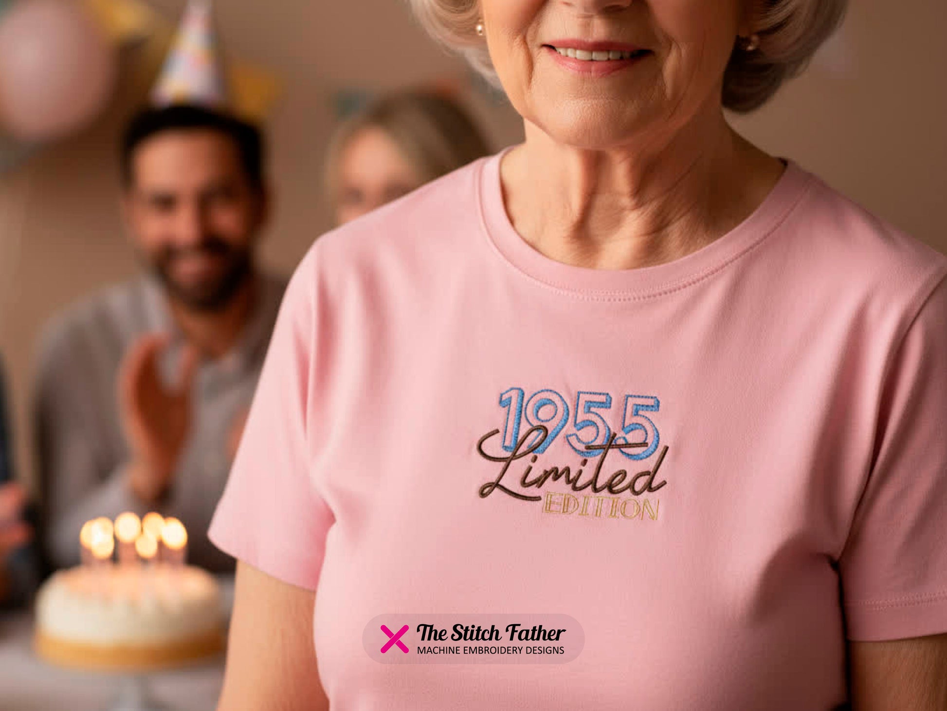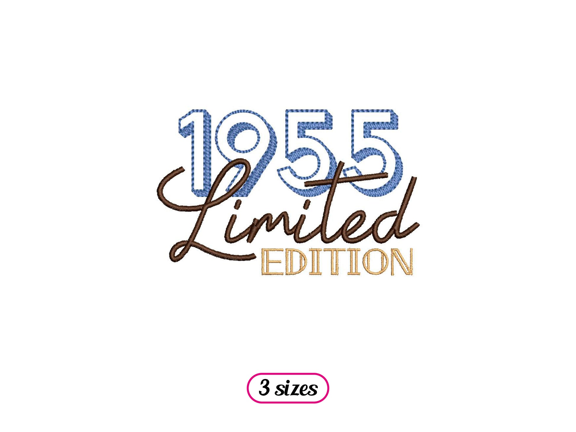*INSTANT DOWNLOAD* “1955 LIMITED EDITION” machine embroidery design. Birthday logo of the year 1955, satin stitch and fill stitch with running stitch details, 3 steps. The white areas are open to fabric. An elegant pattern to make unique presents for a birthday party!