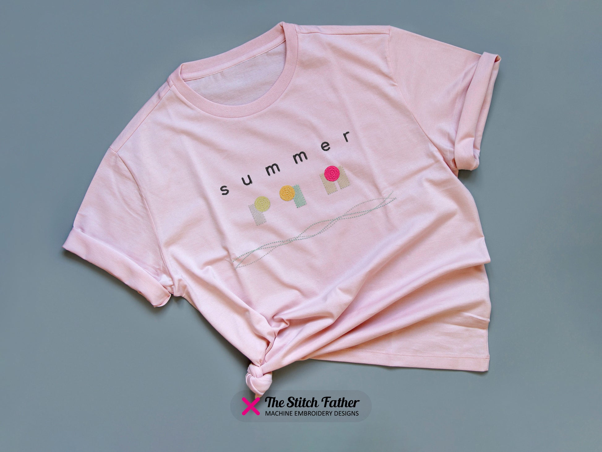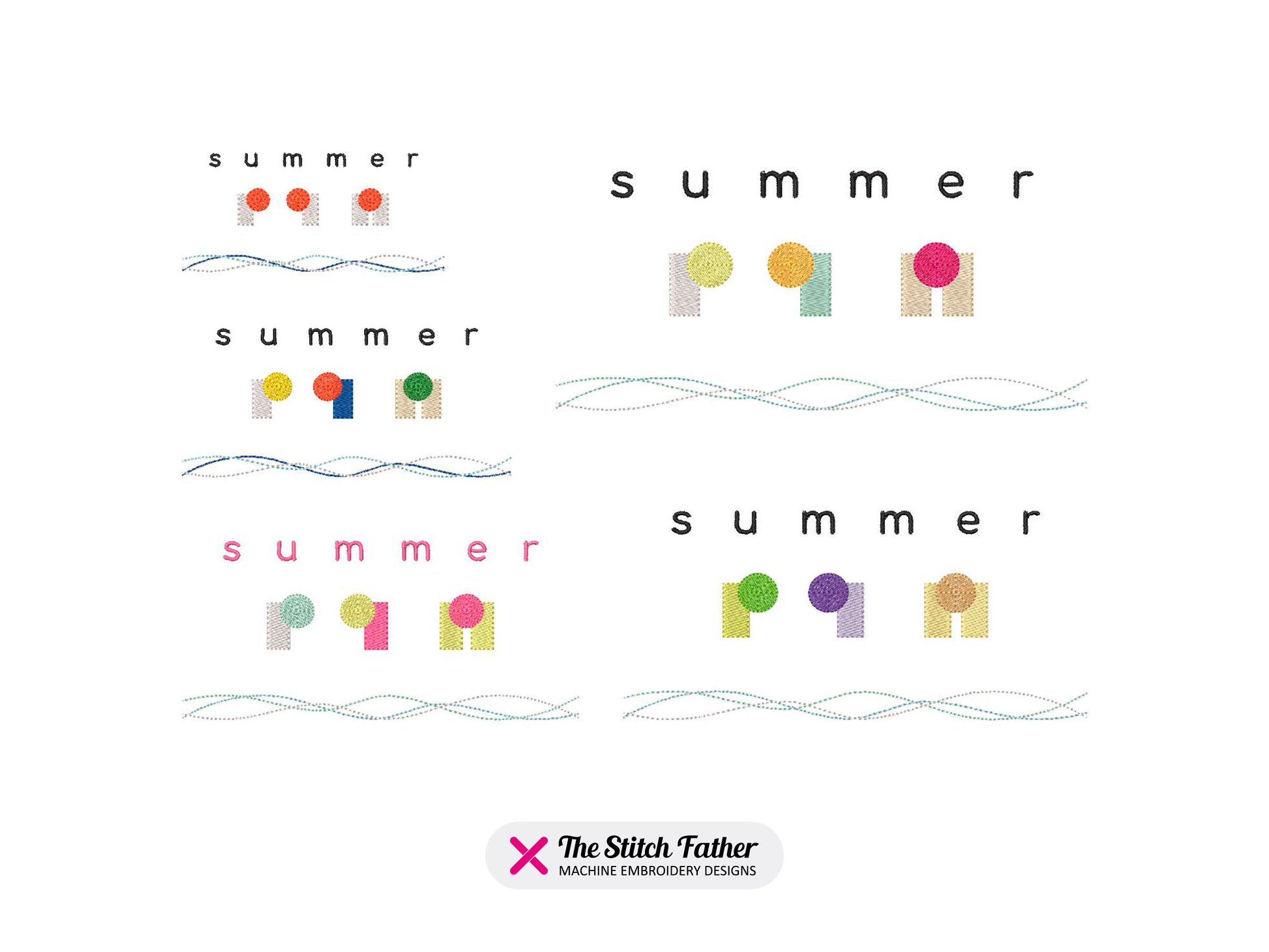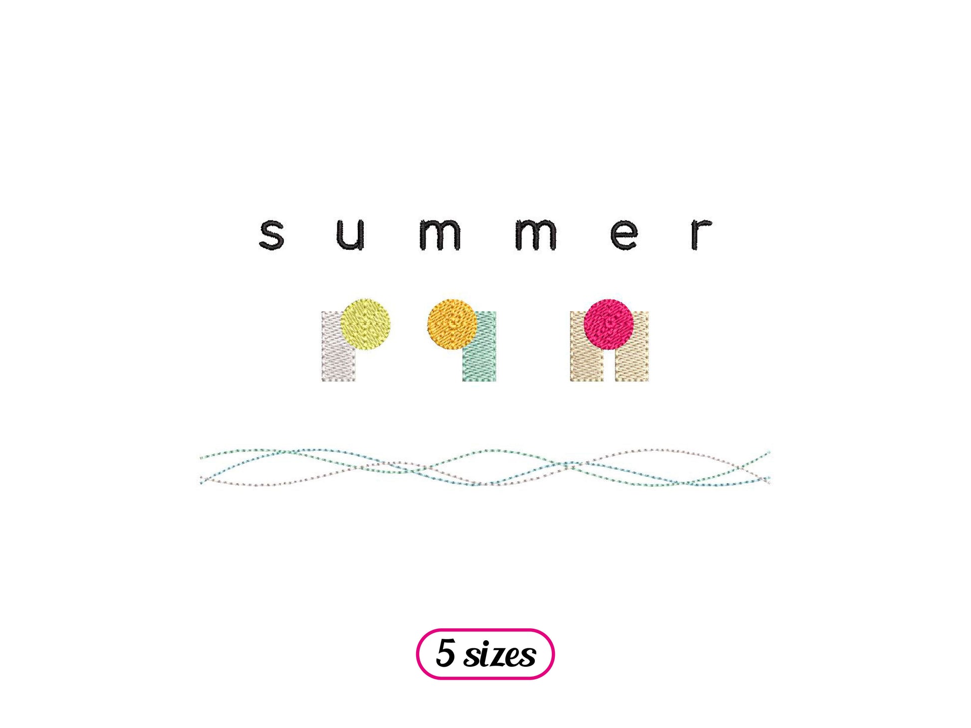 *INSTANT DOWNLOAD* “SUMMER BEACH” machine embroidery design. Summer logo composed of four beach towels and three parasols viewed from above with the text “summer” at the top and waves at the bottom, fill stitch with running stitch details, 10 steps. A trendy minimalist logo that you can easily customize with your own colors to match your style!