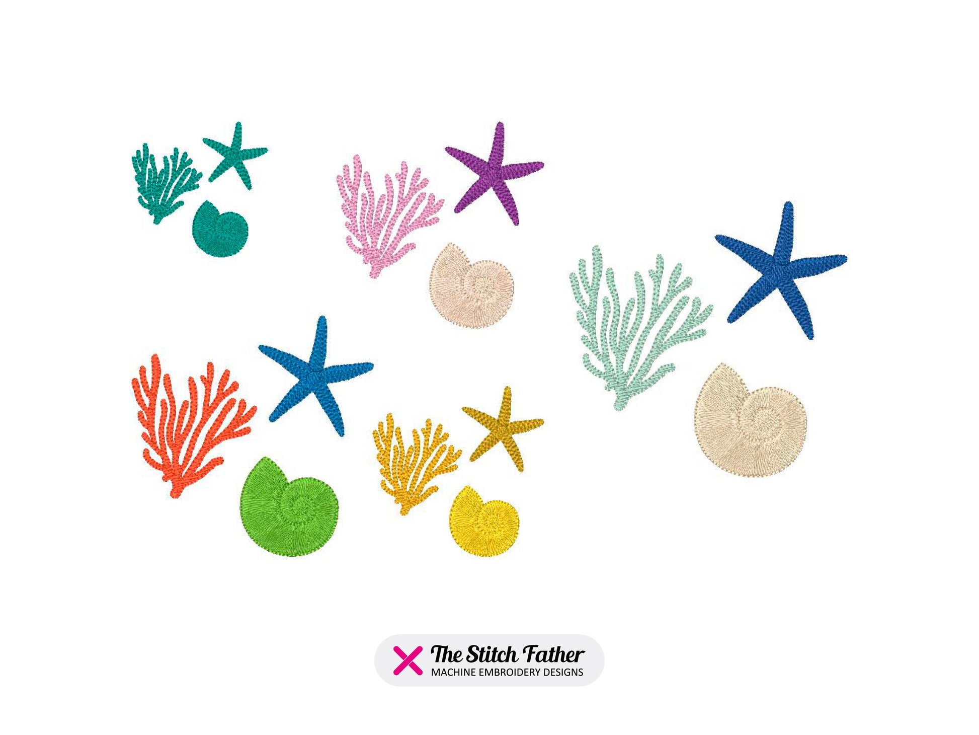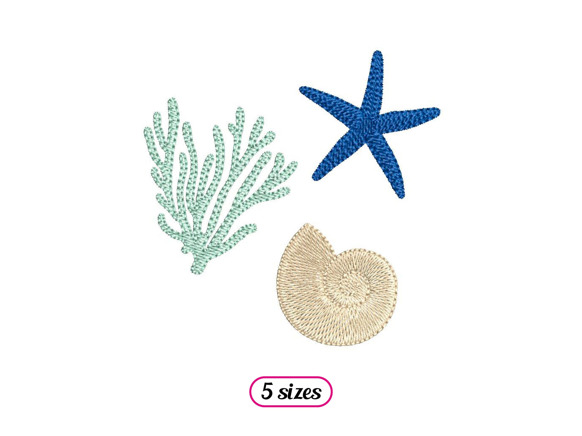 *INSTANT DOWNLOAD* “SHELL CORAL STARFISH” machine embroidery design. Group of three marine animal (coral, starfish and nautilus shell), fill stitch with running stitch details, 3 steps. A simple and elegant embroidery to embellish your summer fabrics using your three favorite colors!