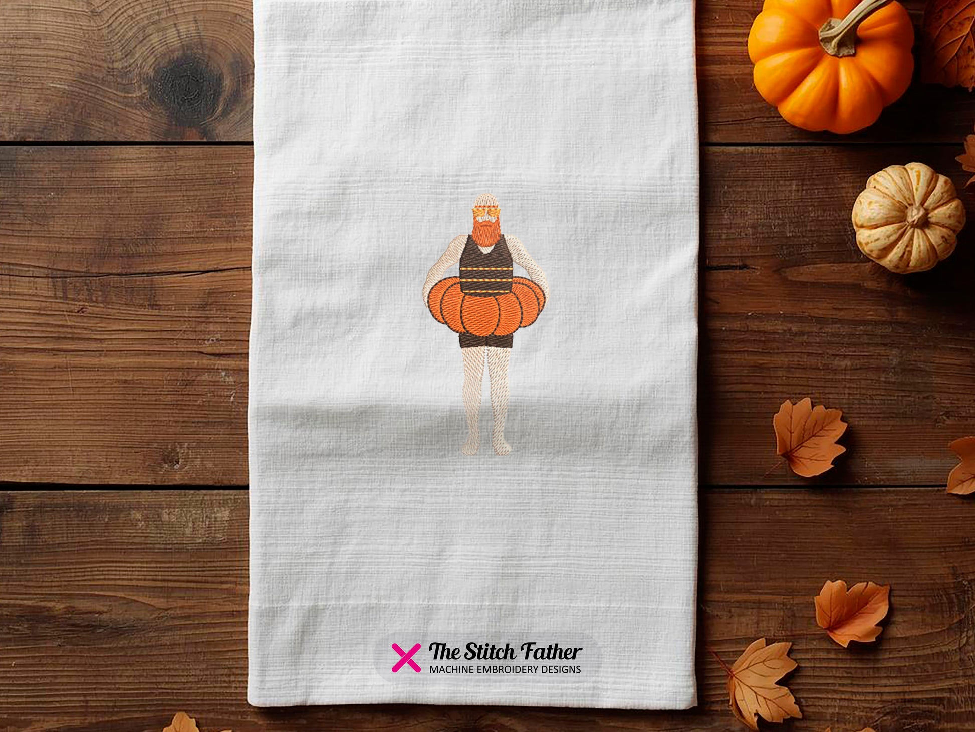 *INSTANT DOWNLOAD* MAN SWIM RING PUMPKIN machine embroidery design. Bearded man wearing a retro swimming suit and holding a pumpkin swim ring, fill stitch with running stitch details, 6 steps. Add a quirky touch to your summer clothing and accessories or make a funny Halloween costume!