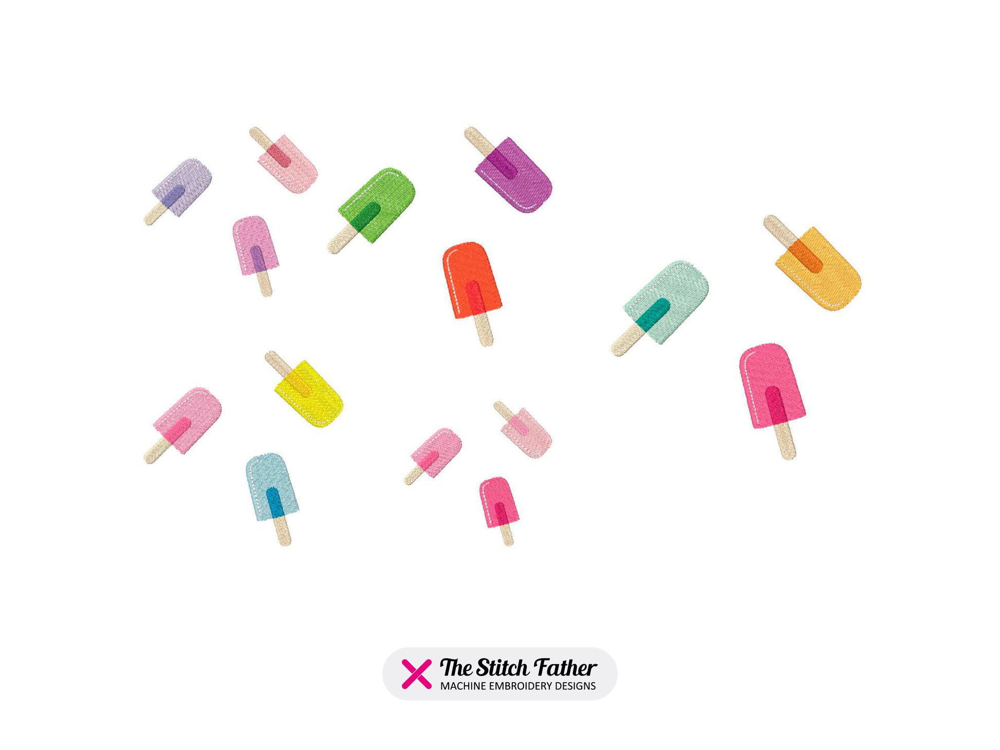 *INSTANT DOWNLOAD* “ICE LOLLIES” machine embroidery design. Group of water ices, fill stitch with running stitch details, 12 steps. Have fun, play with colors to create transparency effects and make stunning refreshing projects for summer!