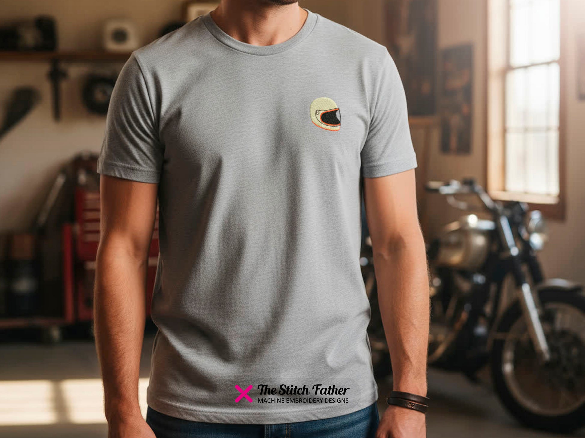 *INSTANT DOWNLOAD* “HELMET” machine embroidery design. Full-face helmet, three-quarter view, fill stitch with running stitch details, 3 steps. The white areas are open to fabric. Bring a dash of biker spirit to your creations with this small motorcycle helmet embroidery design, the perfect touch for any motorcycle lover’s gear, jacket, or accessory!