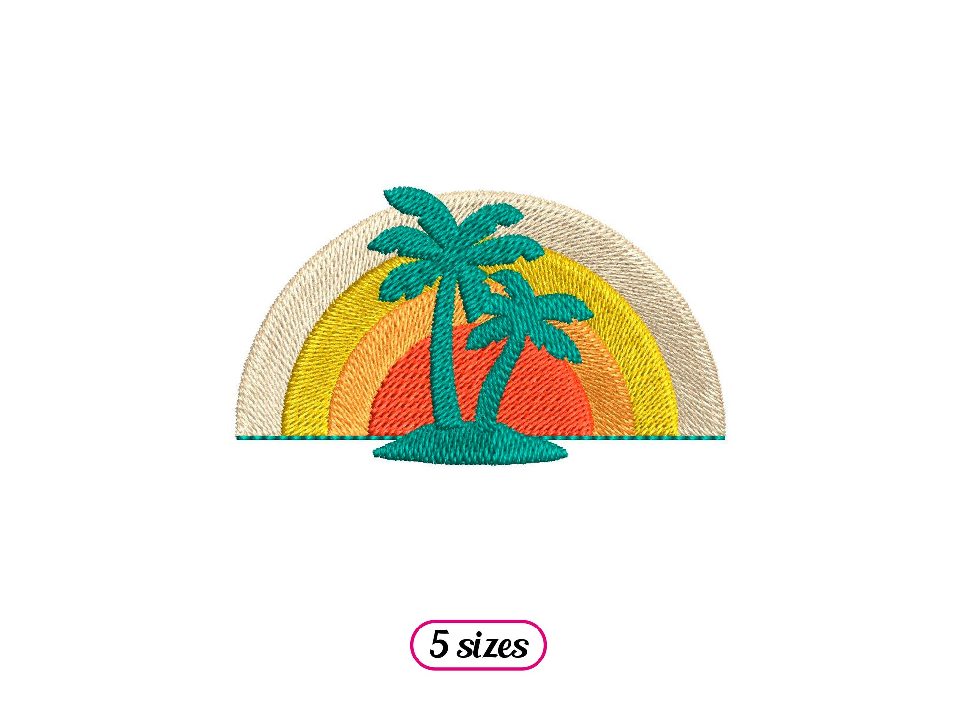 *INSTANT DOWNLOAD* “PALM TREE SUNSET LOGO” machine embroidery design. Beach landscape representing a sunset behind palm trees, fill stitch with running stitch line, 5 steps. A great colorful vintage logo for beach lovers!