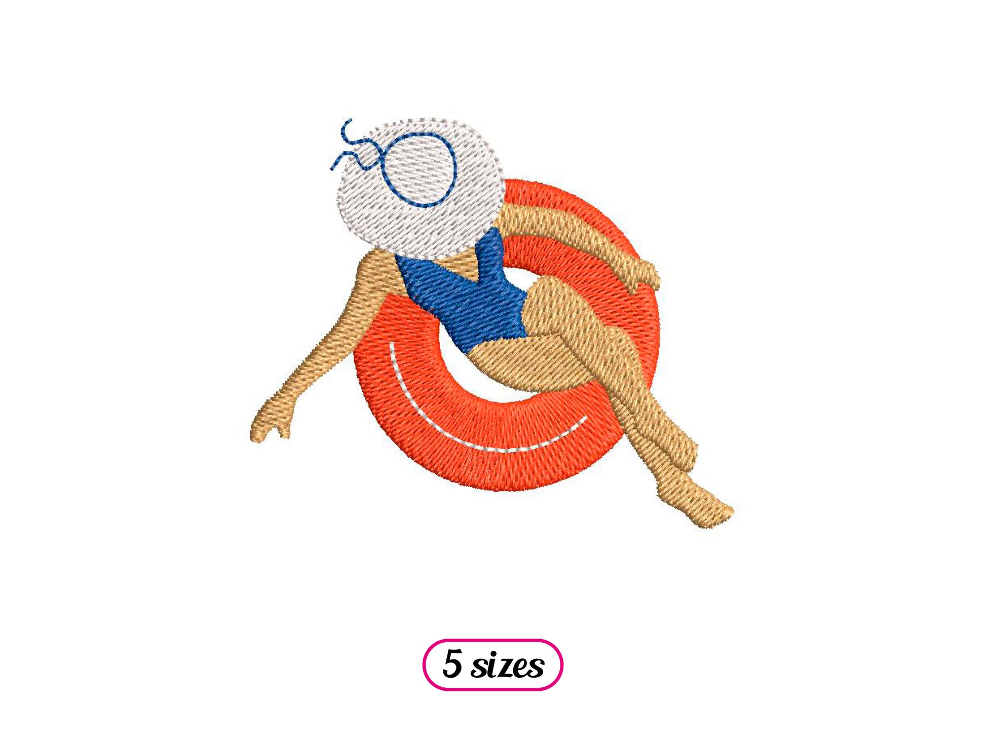 *INSTANT DOWNLOAD* WOMAN SWIM RING machine embroidery design. Retro chic pattern representing an elegant lady relaxing on a swim ring, top view, fill stitch with running stitch details, 5 steps. A beautiful summer pattern to add a vintage touch to your fabrics!
