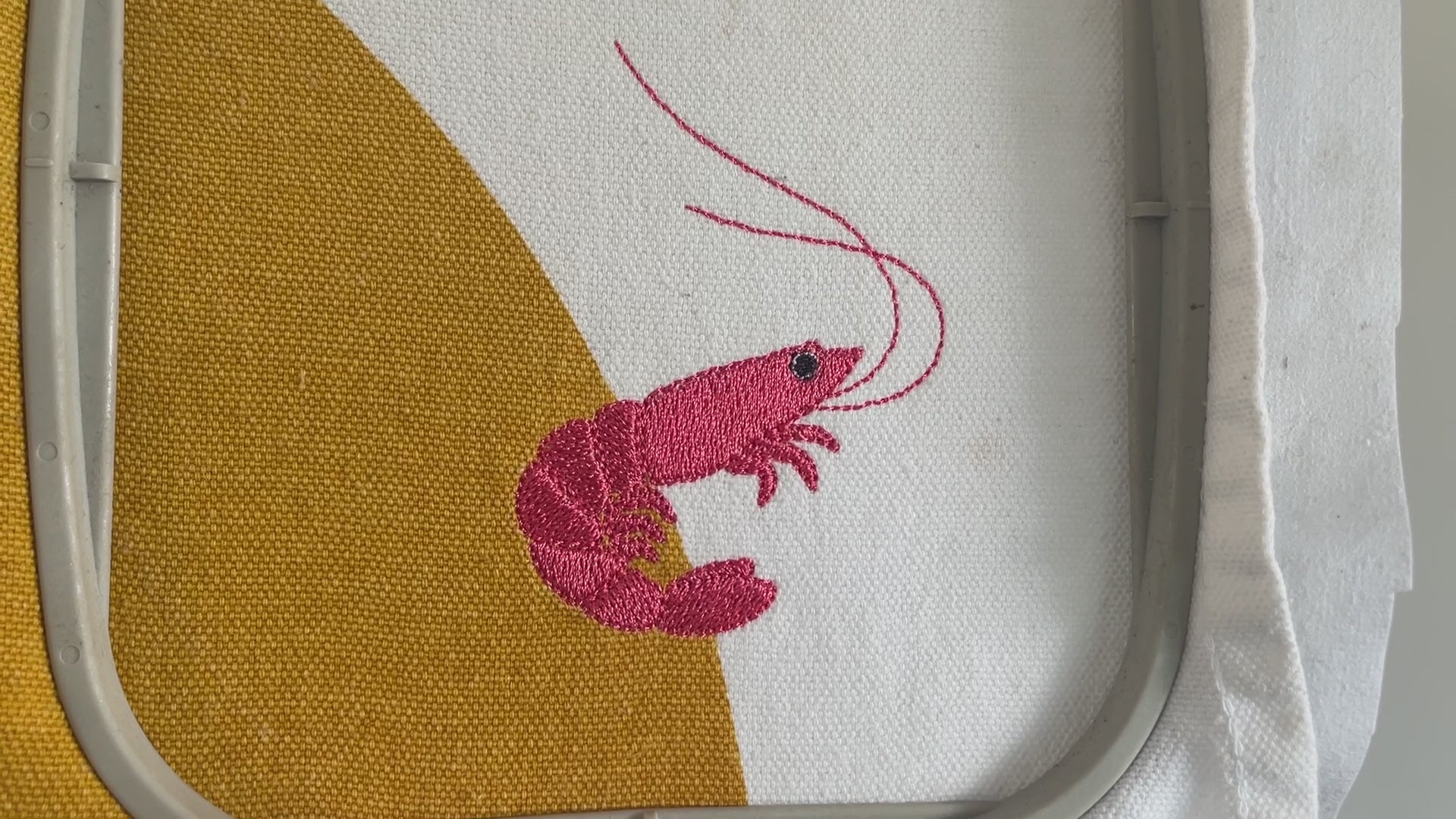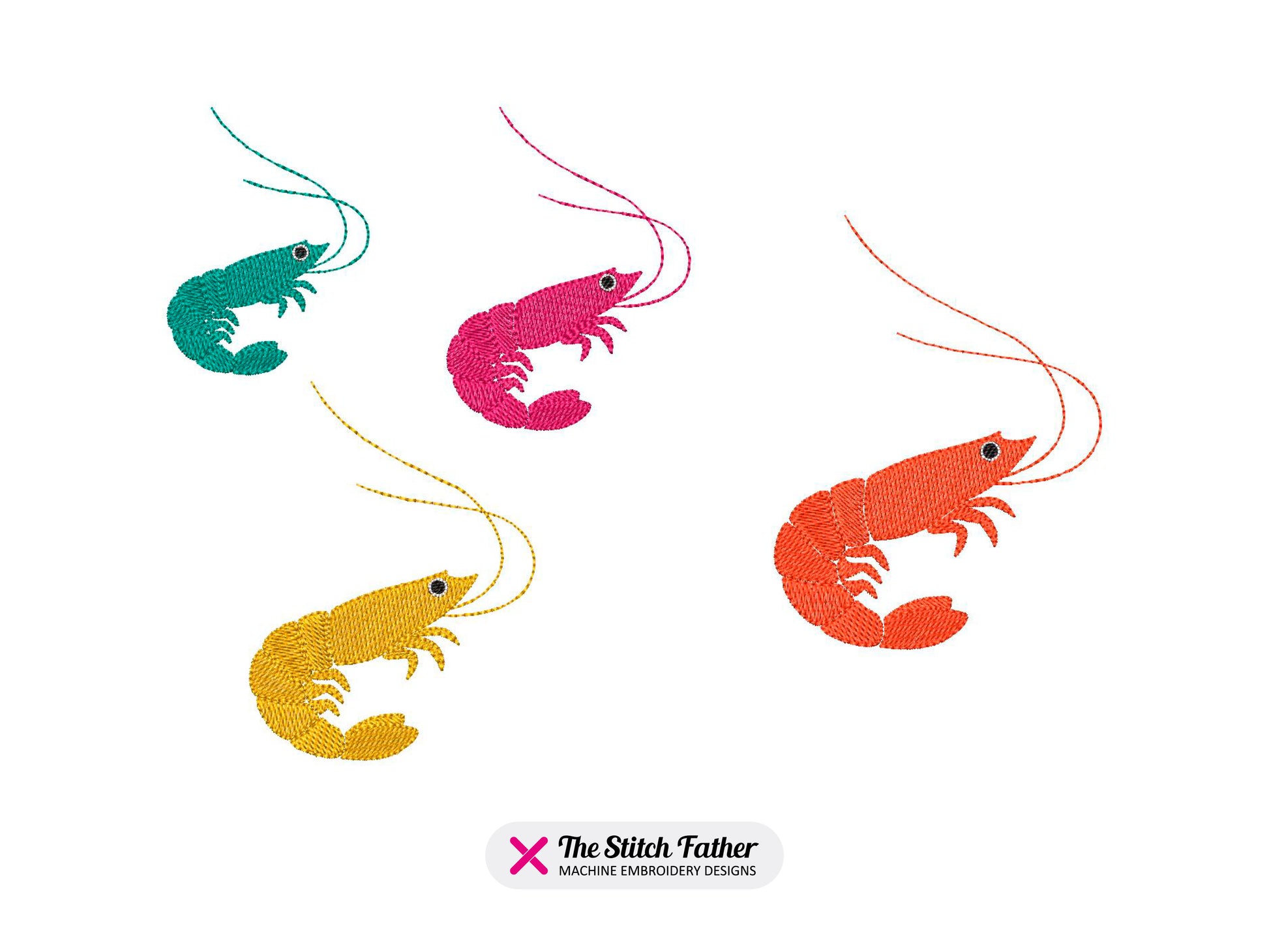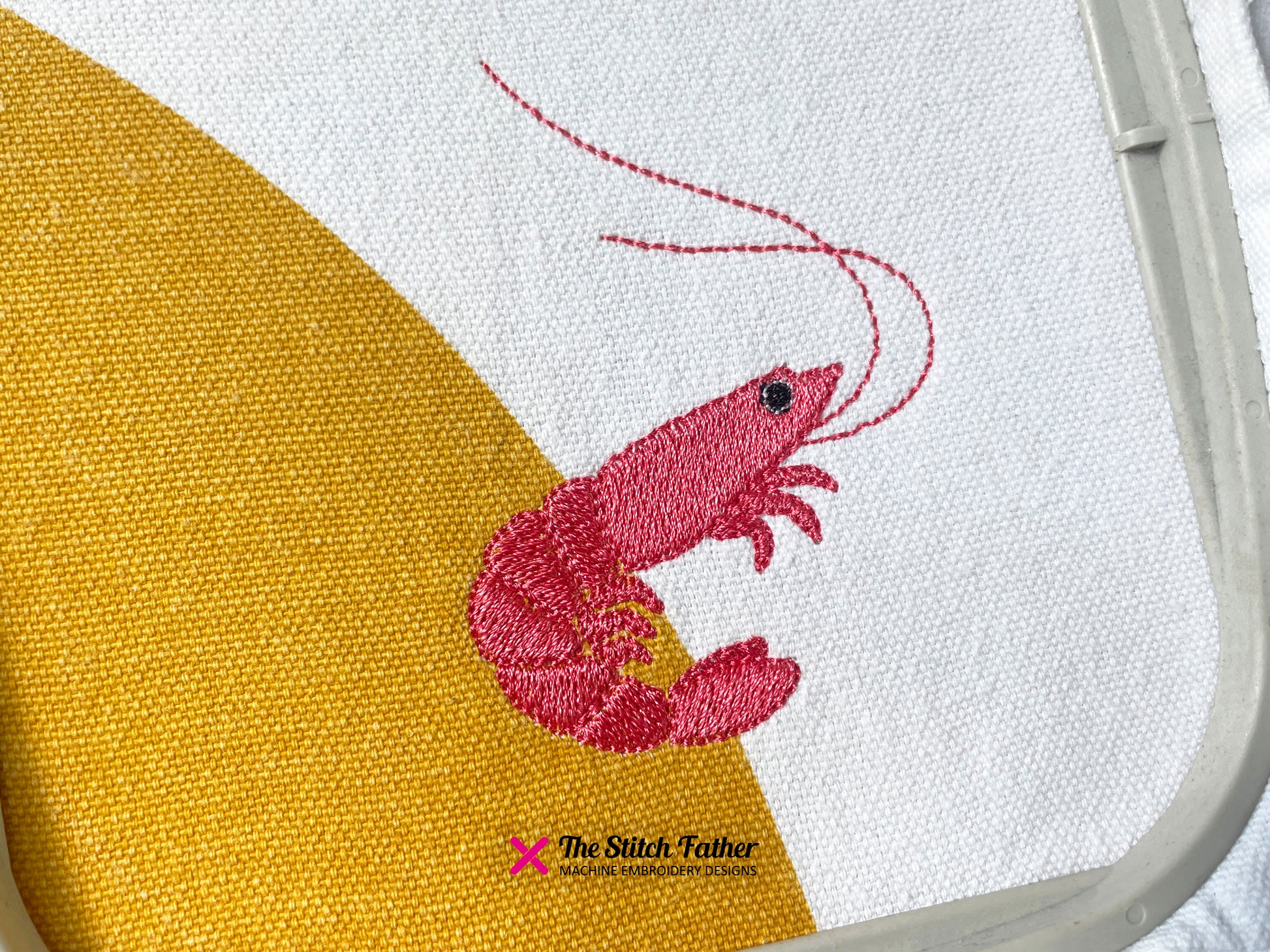 *INSTANT DOWNLOAD* “SHRIMP” machine embroidery design. Realistic shrimp, fill stitch with running stitch details, side view, 3 steps. A little sea creature to customize your kitchen fabrics, beach accessories and more!