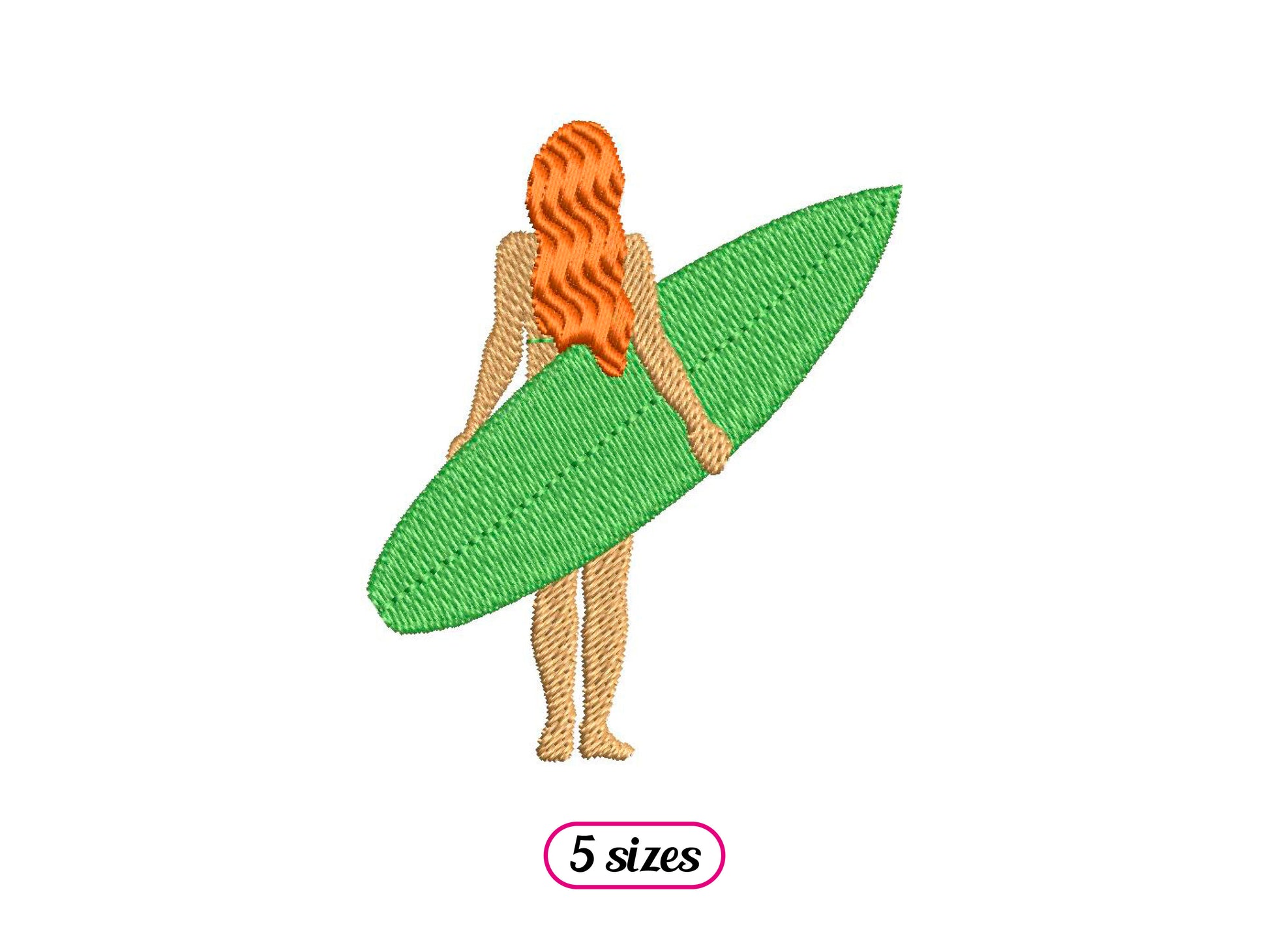 *INSTANT DOWNLOAD* "WOMAN SURFBOARD" machine embroidery design. Standing surf girl holding her board, back view, fill stitch with running stitch lines and motif stitch to add fine details, four steps. A unique design for ocean lovers!