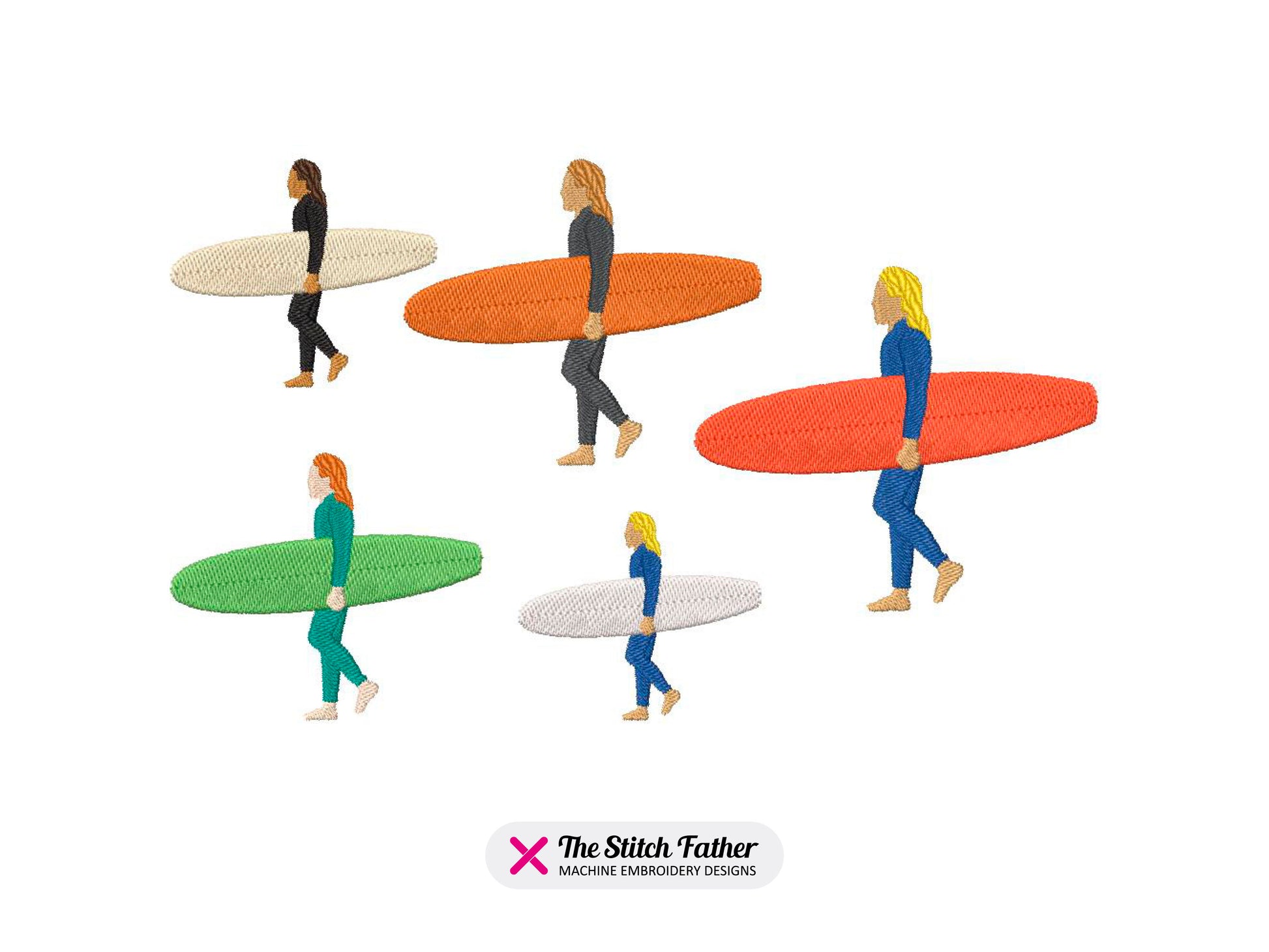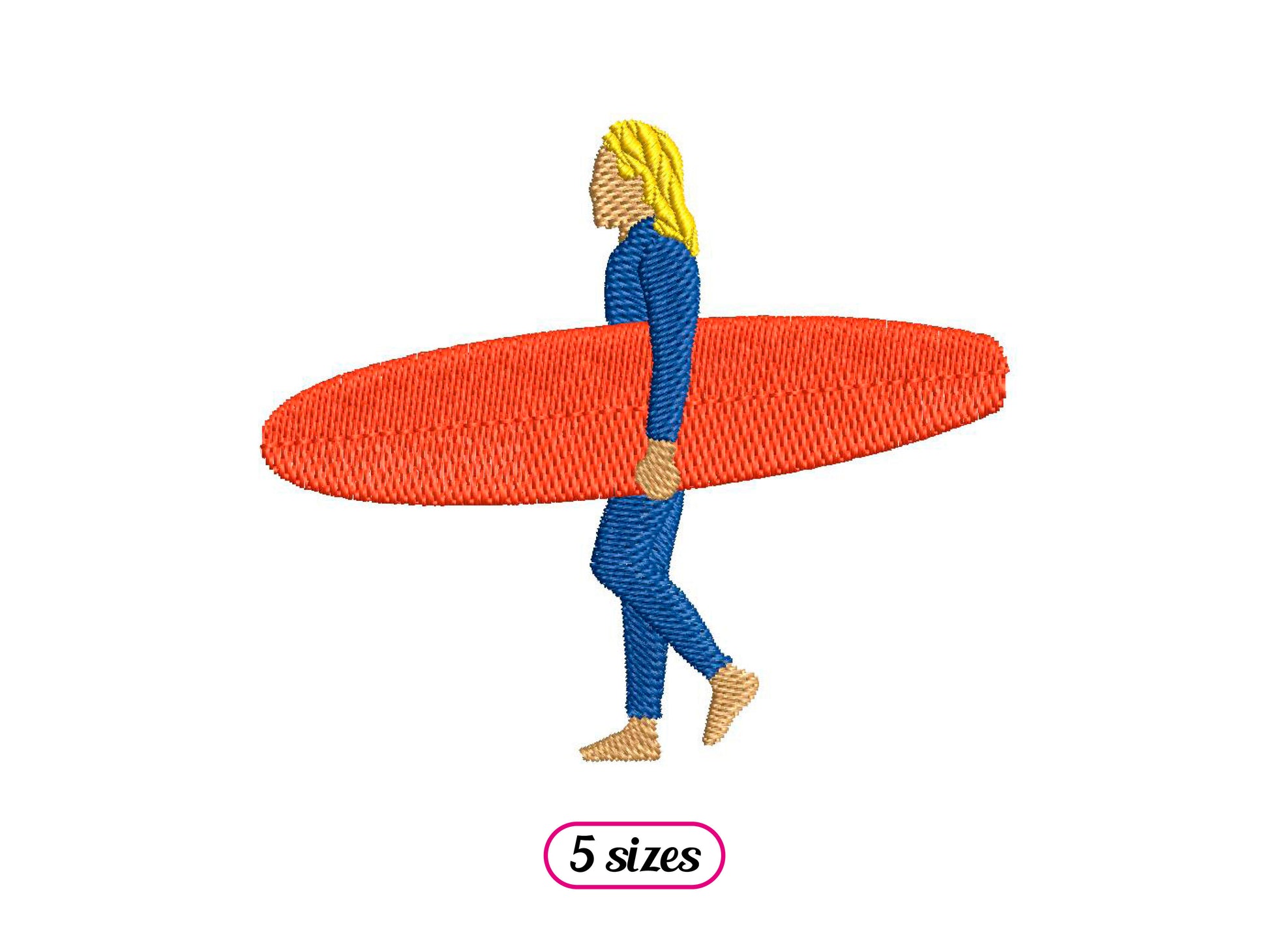 *INSTANT DOWNLOAD* MAN SURFBOARD WALK machine embroidery design. Fill stitch surfer man with running stitch lines and motif stitch to add fine details, six steps. A unique design for ocean lovers!