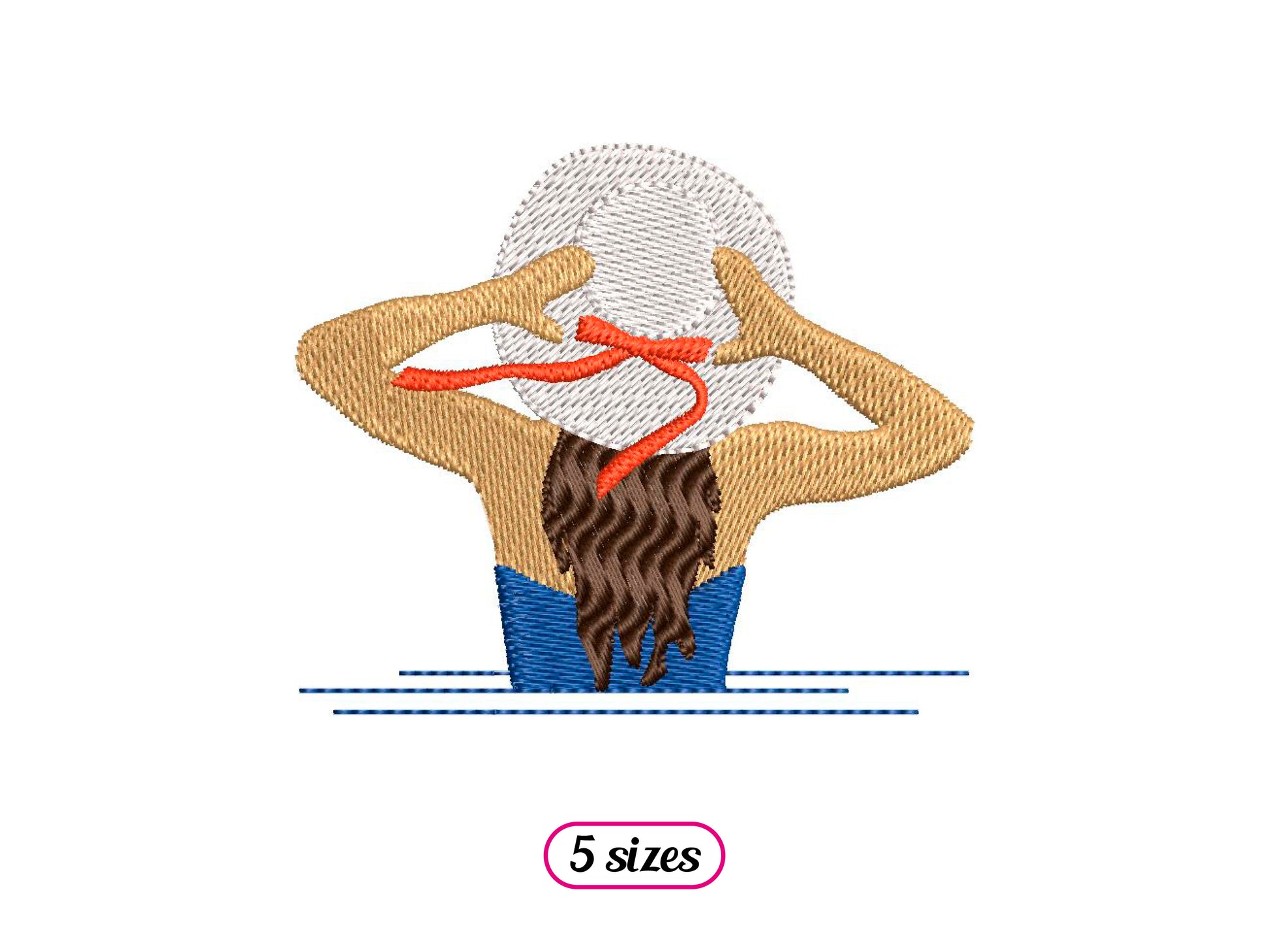 *INSTANT DOWNLOAD* WOMAN HAT SEA machine embroidery design. Back view of a lady in the sea, holding her sun hat while the wind is blowing, 6 steps. A beautiful retro chic embroidery for your summer clothing, use the bottom space as a name placement!