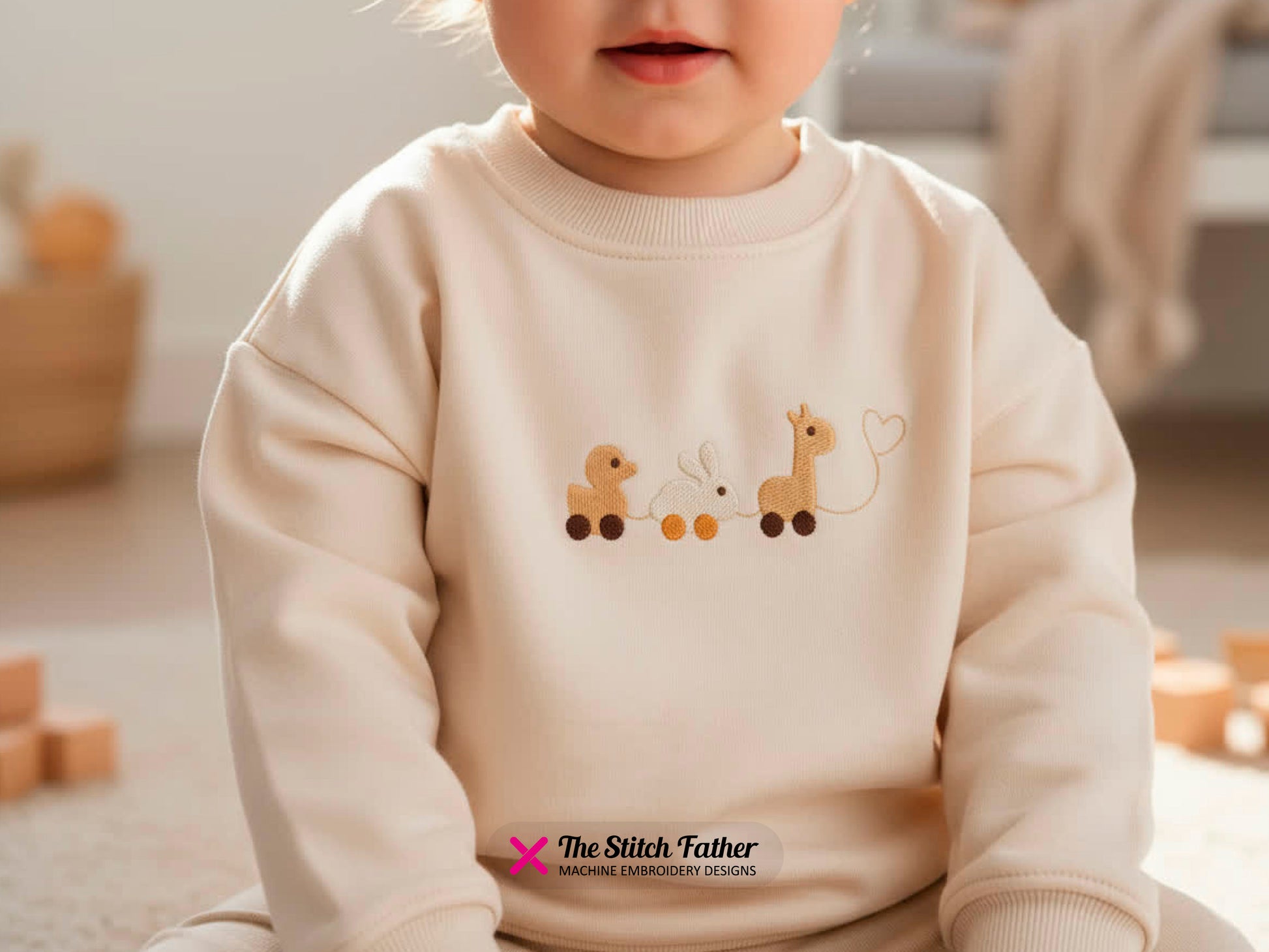 *INSTANT DOWNLOAD* TOY ANIMAL TRAIN machine embroidery design. Wood train with three animals (duck, rabbit and giraffe), 4 steps. A cute traditional toy to embellish fabrics for your kids!